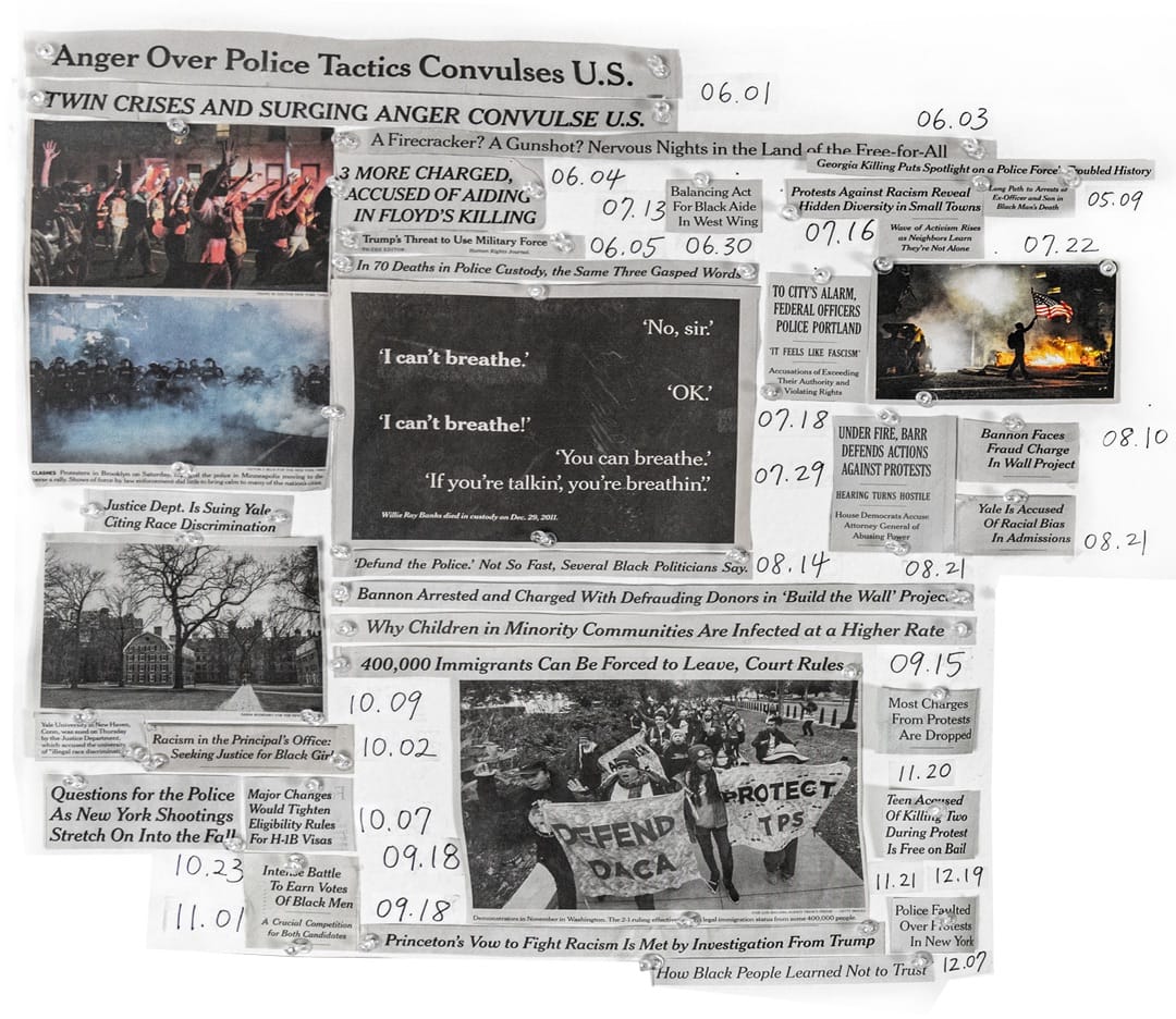 In subsequent rooms, we see panels of photographs and snippets of text that juxtapose fragmented stories from Wisconsin Death Trip with Van Schaick’s photographs of anonymous sitters. Scott’s curation queries the inveterate 24-hour news cycle’s means of distilling tragedy into mere parcels of fleeting information. The perennial nature of our media ecosystem’s dehumanization is evinced by Paul Auster/Spencer Ostrander and Mona Leau’s works, which archive present-day bloodshed and the “red state versus blue state” reductive apparatus.