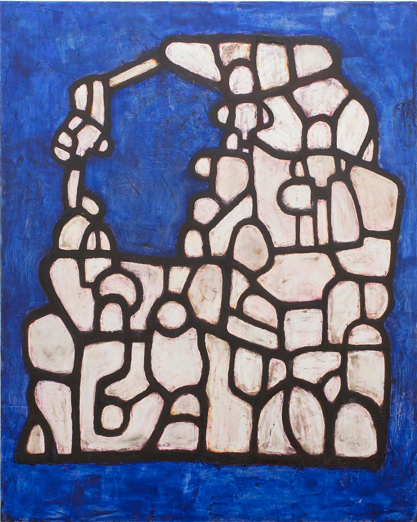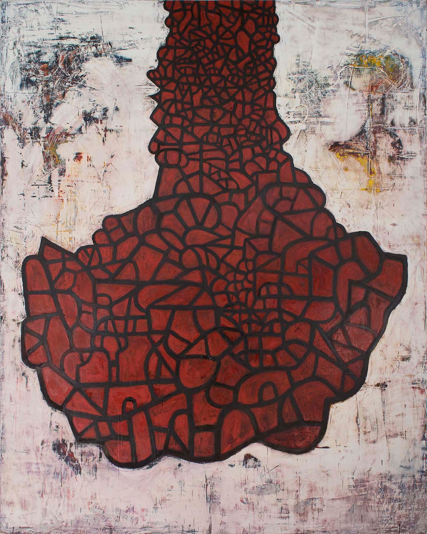The largest painting in the exhibition, “Liberty or Death” (2013-2016), is seven feet high and ten feet across. The palette is brown, ocher, and red, reminiscent of tobacco, mustard, and dried blood. This painting is filled with striped, mallet-like forms streaming into deep space and terminating in the lower left-hand corner. We seem to be standing on a slope, watching them move past as they spread out, diving into two groups in order to make their way around a huge, multi-part form sitting in the middle ground and rising to the painting’s top edge.