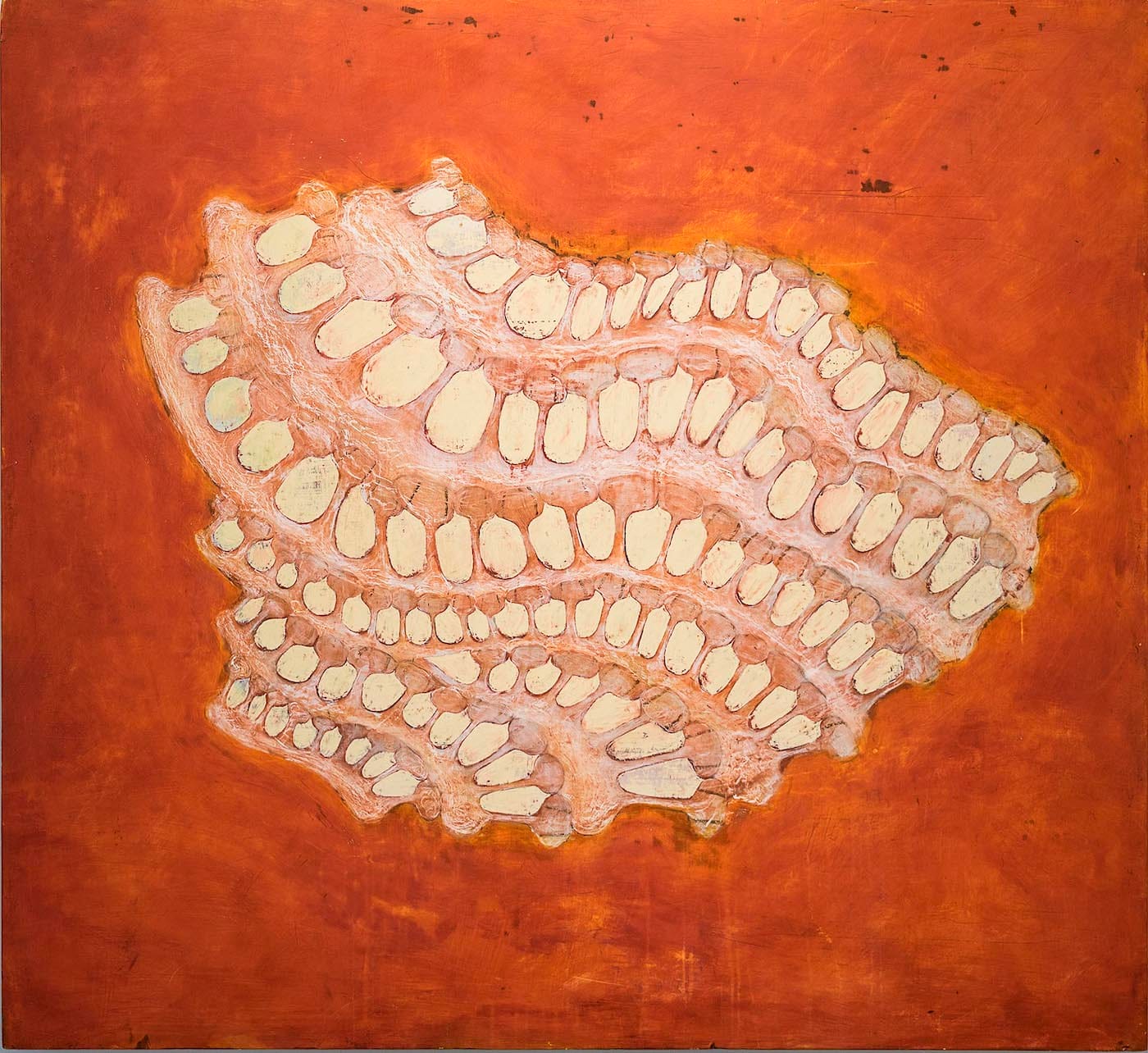 What I like about these recent paintings is the different ways they evoke the body as something awkward and ungainly. Look at the rows of teeth-like shapes in “Red Cavalry” (2010) or the large red, sectioned and spreading form descending from the top edge in “City to Love” (2013-2016) — another painting Webster has worked on for years — and one sees a relentless push by an artist who has always tested what he could do with paint.