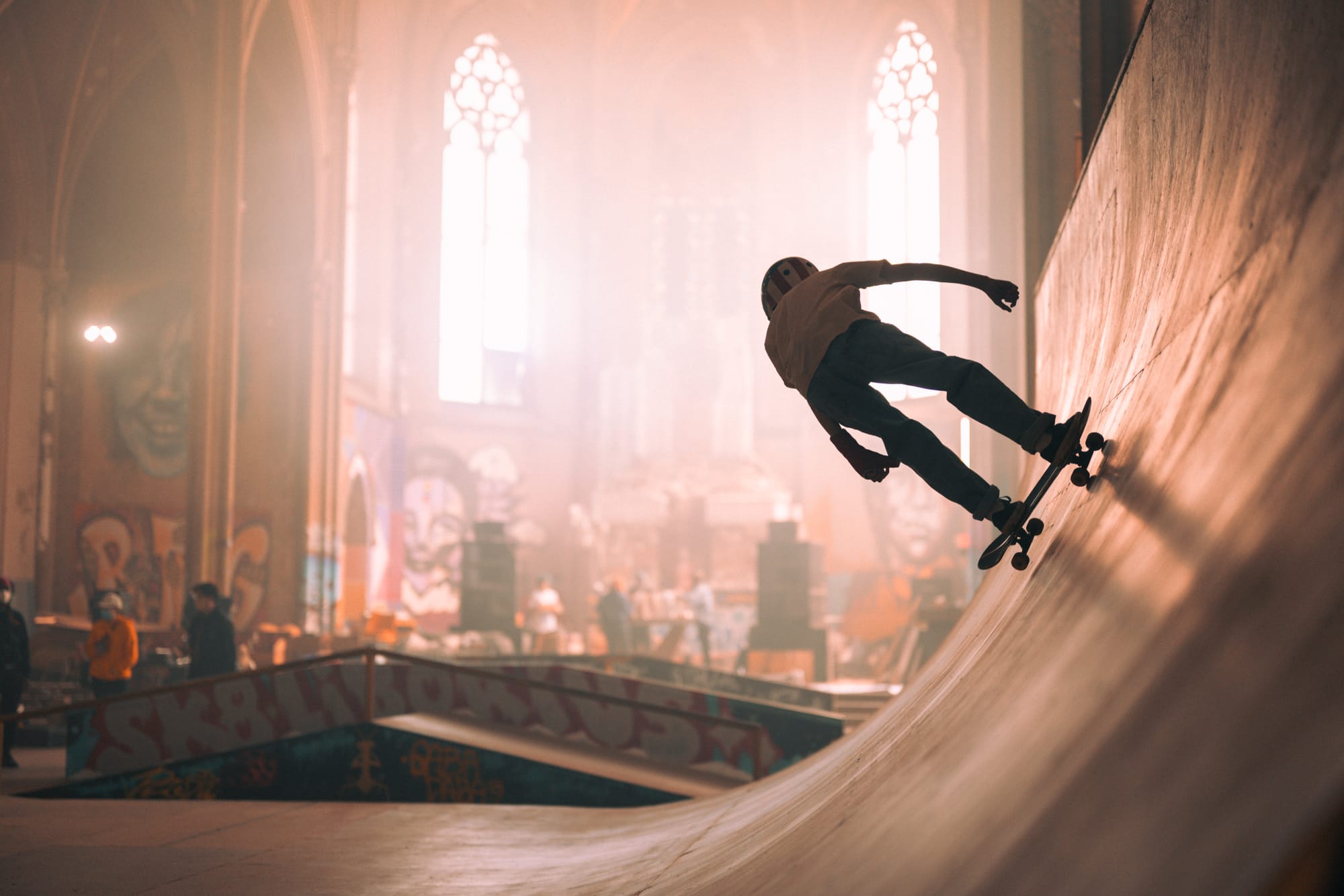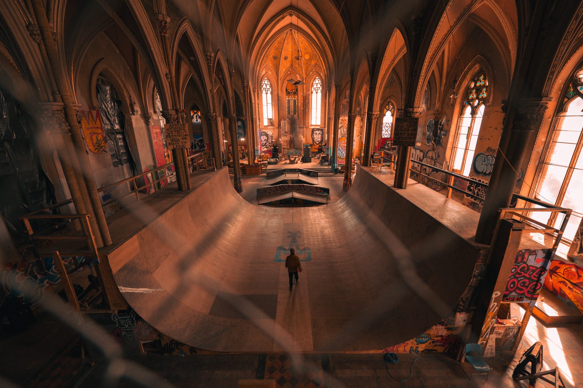 In the Saint Liborius Catholic Church in St. Louis, Missouri, there is a skatepark underneath a Gothic vaulted ceiling and graffiti painted next to 19th-century stained glass windows.