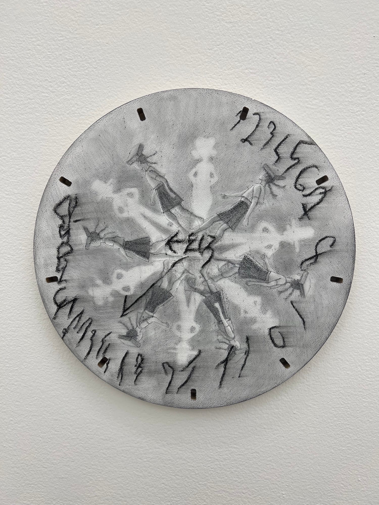 Finally, Kim presents four circular paintings that evoke phenakistoscopes, Victorian-era animation devices that create the illusion of motion when spun. They perfectly encapsulate the feeling, at the heart of the exhibition, that the past is as nebulous as a dream. In “Last Syllables of an Echo" (2022), Mother, Father, and the young schoolgirl are repeatedly presented in poses that suggest movement while hastily scribbled numbers melt off the border around them, indicating that they are trapped in a disintegrating clock. As mere ghosts of the artist’s past, they are frozen in time, uneasy in their stillness and rendered helpless against the shadows that threaten to consume them. Darkness, their old friend, is here to stay, in despite of light.