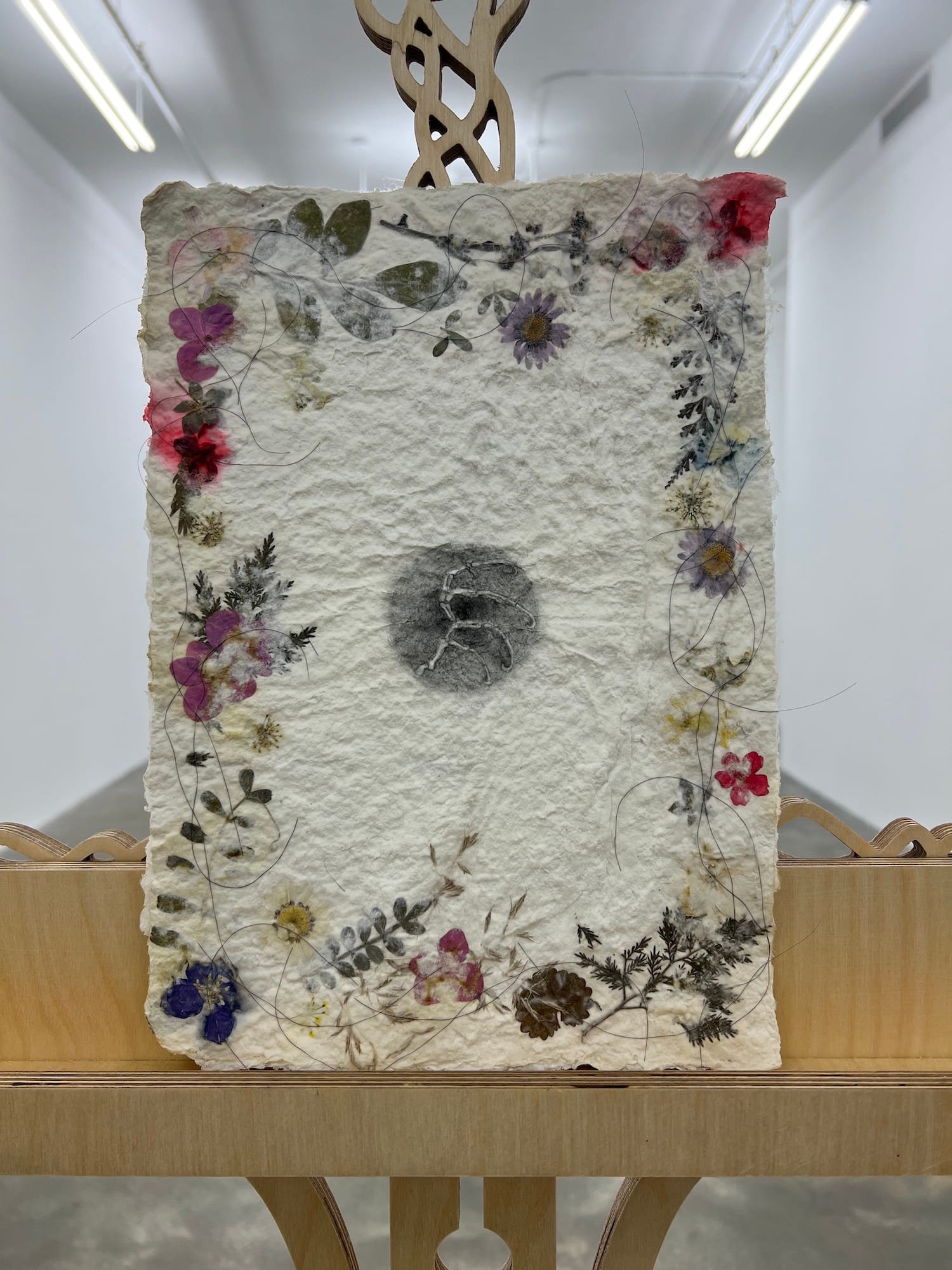 Towering sculptures occupy the gallery’s main hall; they are both a striking and an unsettling introduction to Kim’s tense visual vocabulary. Four birch easels have been painstakingly adorned with imagery that recurs throughout the show, including trees, wheels, spinal vertebrae, and a pair of silhouetted, cartoonish characters: a man with a top hat and a woman with coiffed hair — the prototypical Mother and Father. Emphasizing their largeness, each easel displays small graphite drawings rendered on handmade paper incorporating pressed flowers and trimmings of the artist’s hair. Although these drawings are literally embedded with elements of life, the images depict haunting domestic scenes that border on nightmarish.