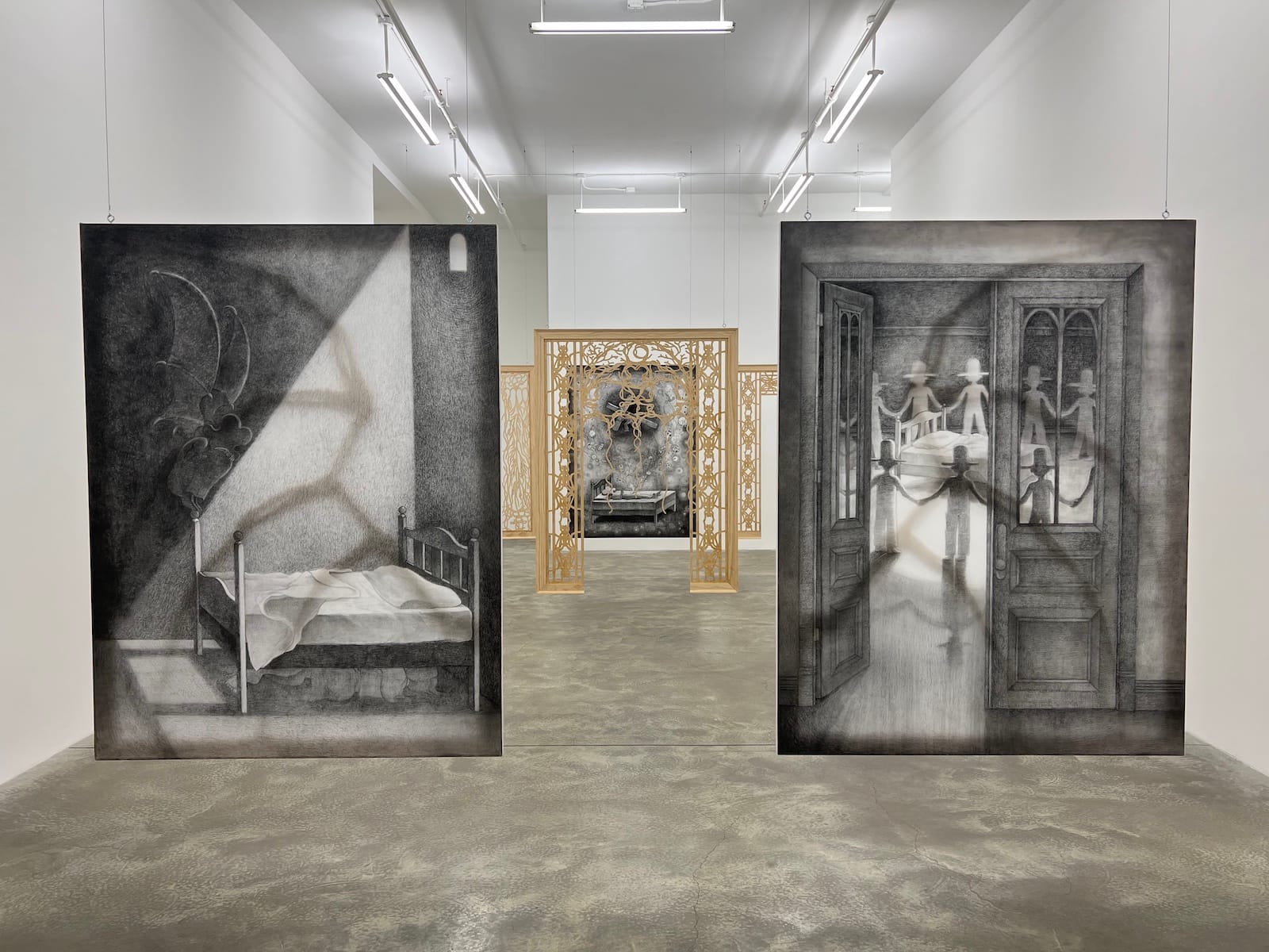 Shadows as symbols of absence and erasure feature heavily in Kim’s work and are intensified in an installation of paintings and woodcarvings hanging from the ceiling. Viewers enter the chapel-like space via archways, thus revealing the images atop exposed stretcher bars to be double-sided paintings reminiscent of windowpanes — Kim’s tribute to Janus, the two-faced god of gateways, dualities, beginnings, and endings.