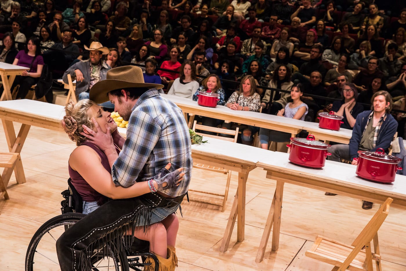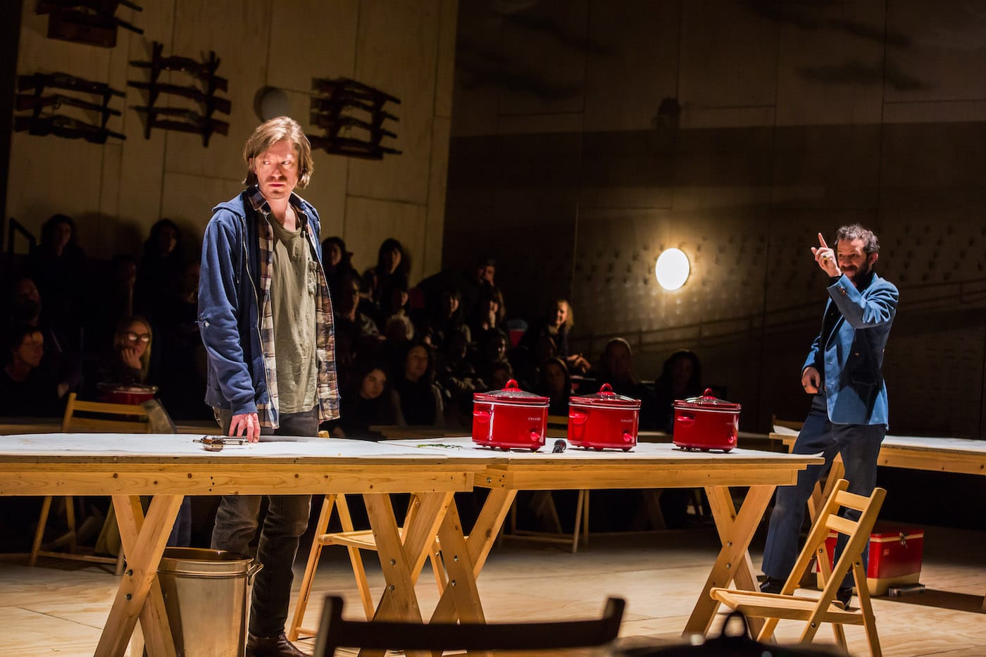 Set designer Laura Jellinek has replaced the “bright golden haze on the meadows” with blond plywood boards nailed into the theater’s walls and floors. Cheap tinsel and a string of lights glitter from the roof of this makeshift bunker of American hell, which also features a muddy greyscale mural of farmlands on the upstage wall. A row of tables line the stage where audiences can sit; chili and corn husks are arranged for later eating and shucking. Entering this Podunk community hall, audiences might also notice the numerous guns that decorate the theater walls like a couple dozen Chekhovian alarms ringing at once.