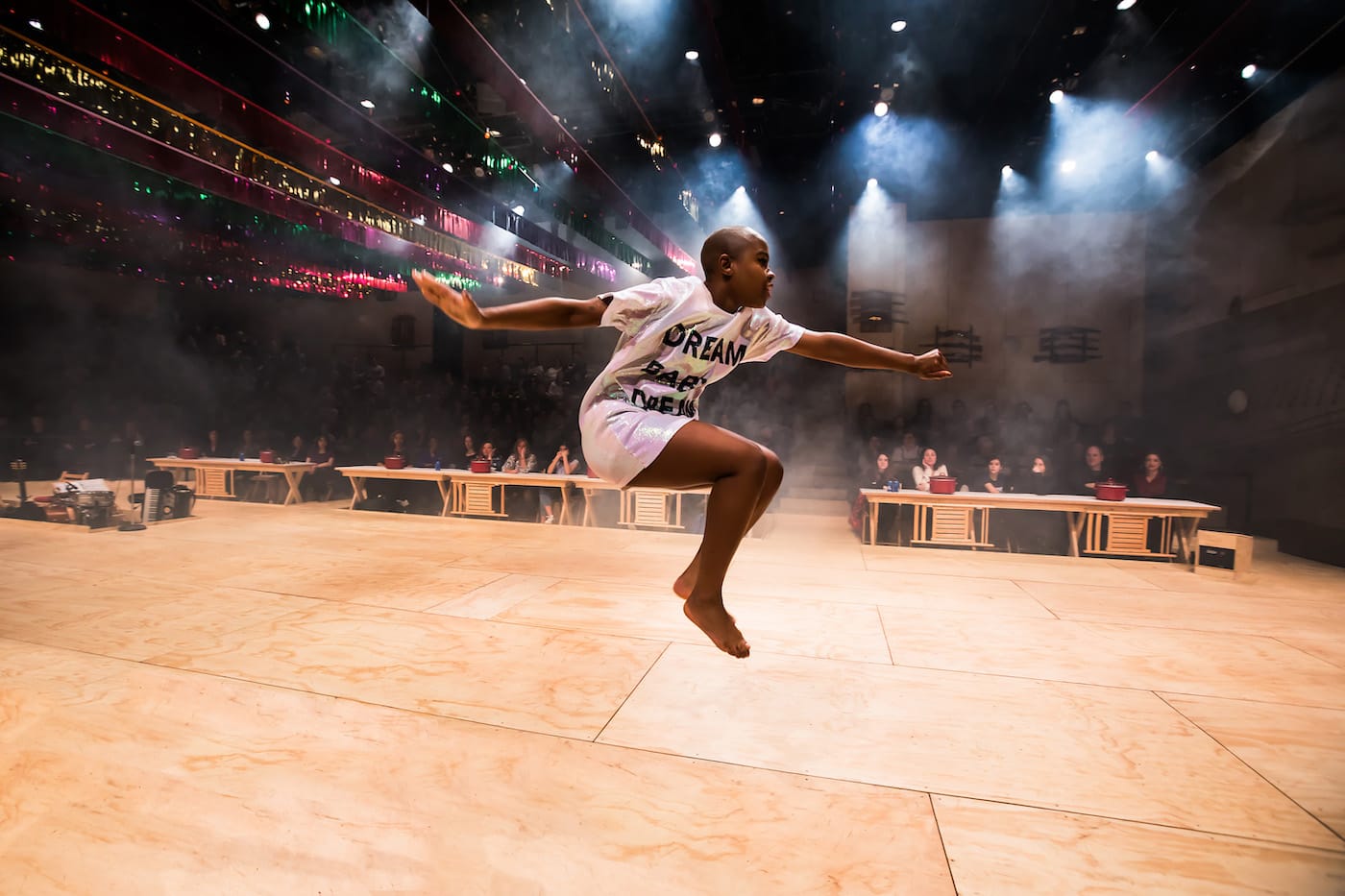 There is a dream ballet that occurs at the second act’s start. Performed by Gabrielle Hamilton, the 13-minute dance is choreographer John Heginbotham’s response to Agnes de Mille’s groundbreaking original. Barefoot and bald, Hamilton gallops across the stage wearing a glittering shirt that reads: “Dream Baby Dream.” It’s a ghostly waltz set to electric guitar and telephonic versions of the Oklahoma! score. The dancer is as imposing as she is captivating, becoming an embodiment of Laurey’s latent sexuality and prowess. She holds the audience’s gaze and transmutes it into a series of sultry body isolations and modernist twists.
