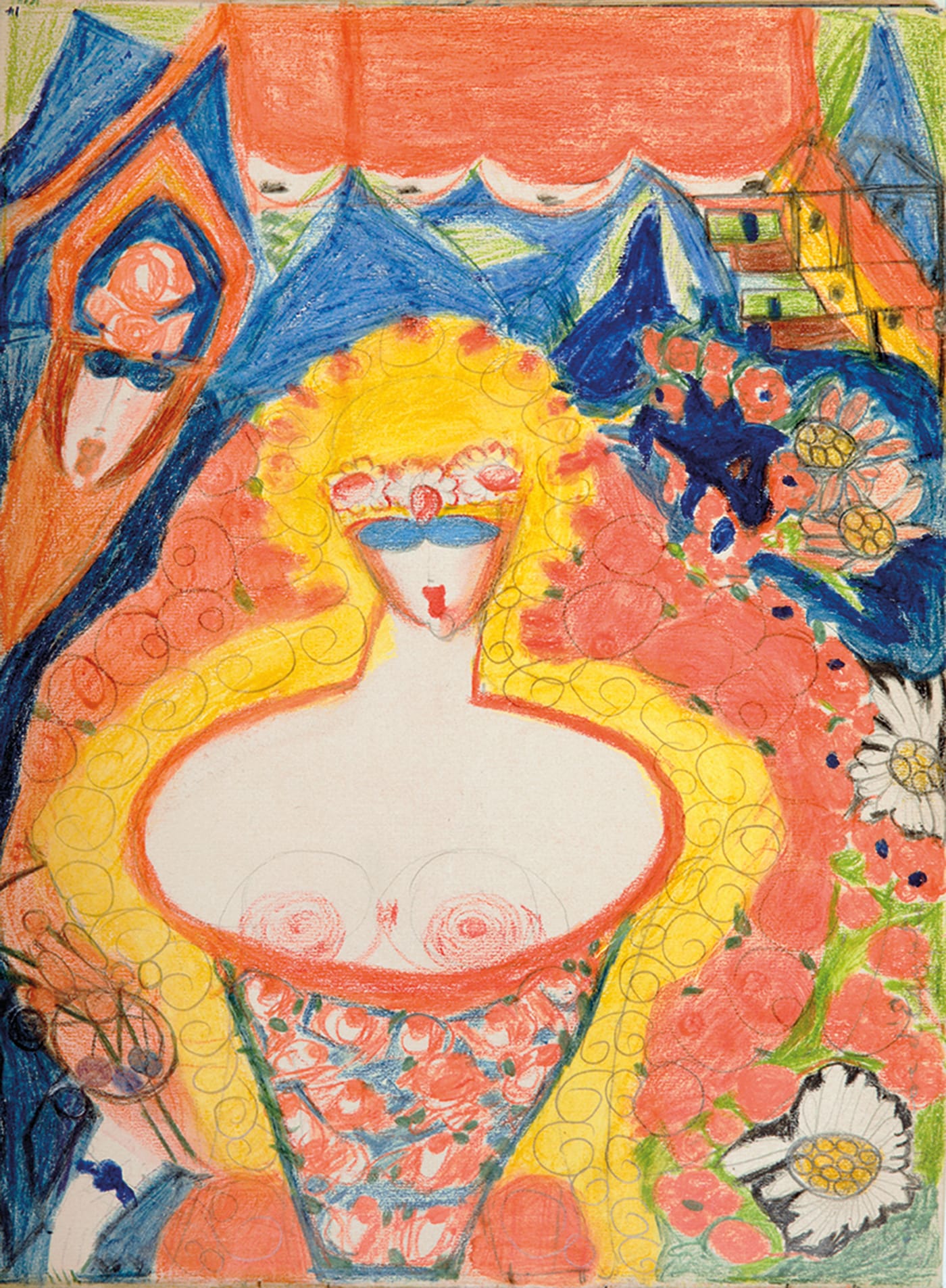One of the definitive art brut makers whose works Dubuffet began collecting during his first prospecting trips to Switzerland in the 1940s, Corbaz had served as a governess at the court of the German emperor Wilhelm II in the early 1900s. After her return to her homeland around the start of World War I, Corbaz was diagnosed with schizophrenia. Many of the boldly colored drawings she went on to make depict handsome German soldiers in their uniforms, while others give visible form to her romantic fantasies regarding the Kaiser.