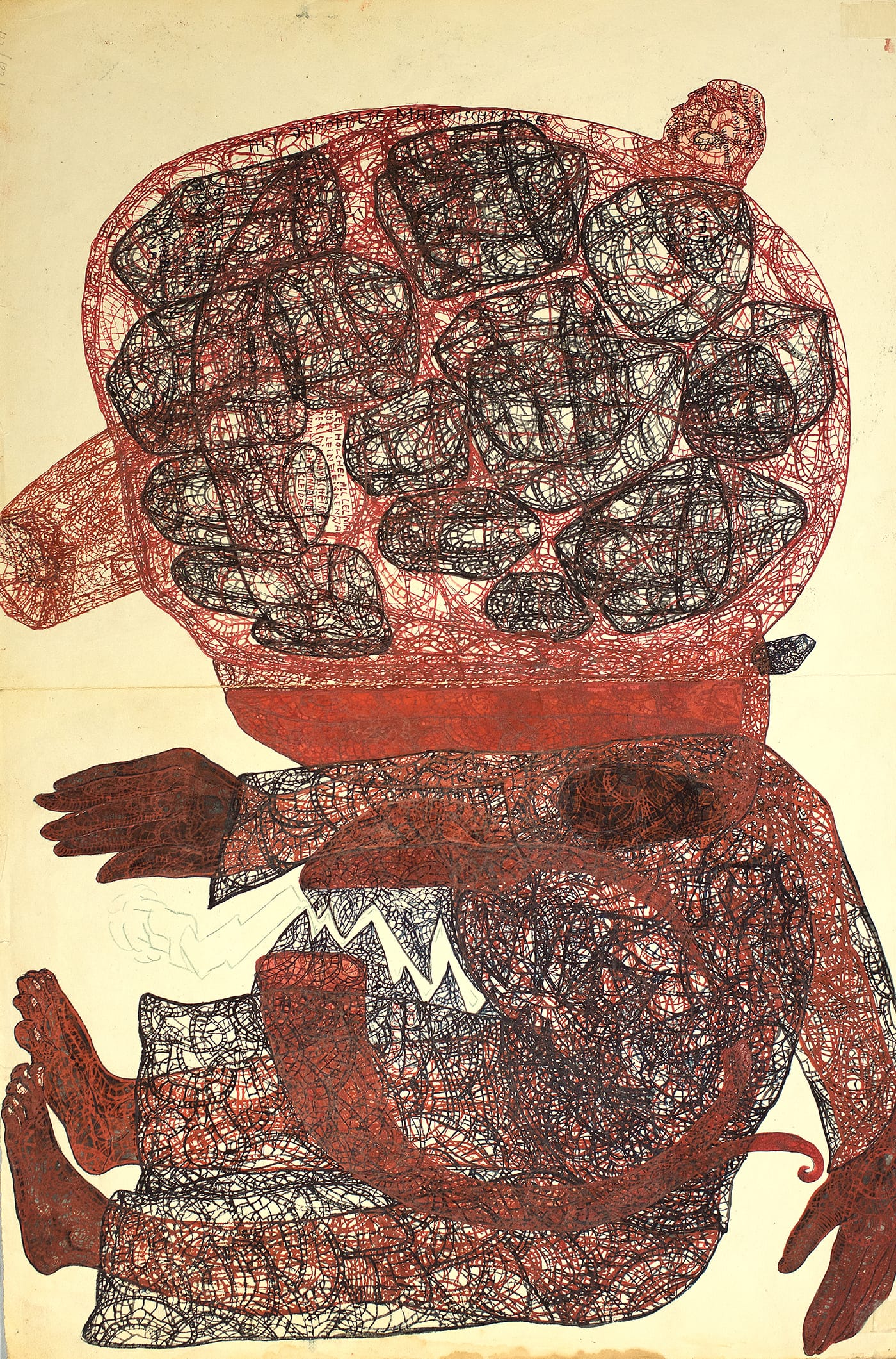 The collector-curator was referring to the fact that certain artists’ works appear in more than one section of the exhibition, given that some are to be found in more than one of the historical collections represented here. As it turns out, it is both enjoyable and informative to encounter drawings by the Swiss Aloïse Corbaz (1886–1964), or by the English Madge Gill (1882–1961), or yarn-covered, enigmatic objects by the American Judith Scott (1943–2005), in more than one spot as the exhibition unfolds, for they offer useful points of reference and comparison for some of the less familiar pieces on display, as well as the works of such non-Western artists as Guo Fengyi, from China, or Tae Takubo, from Japan.