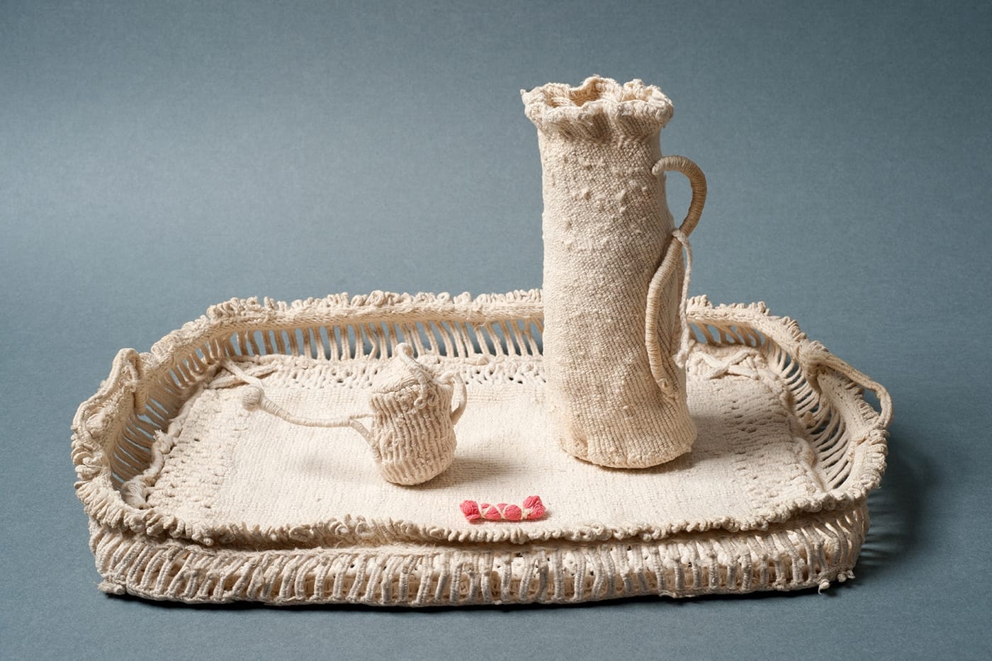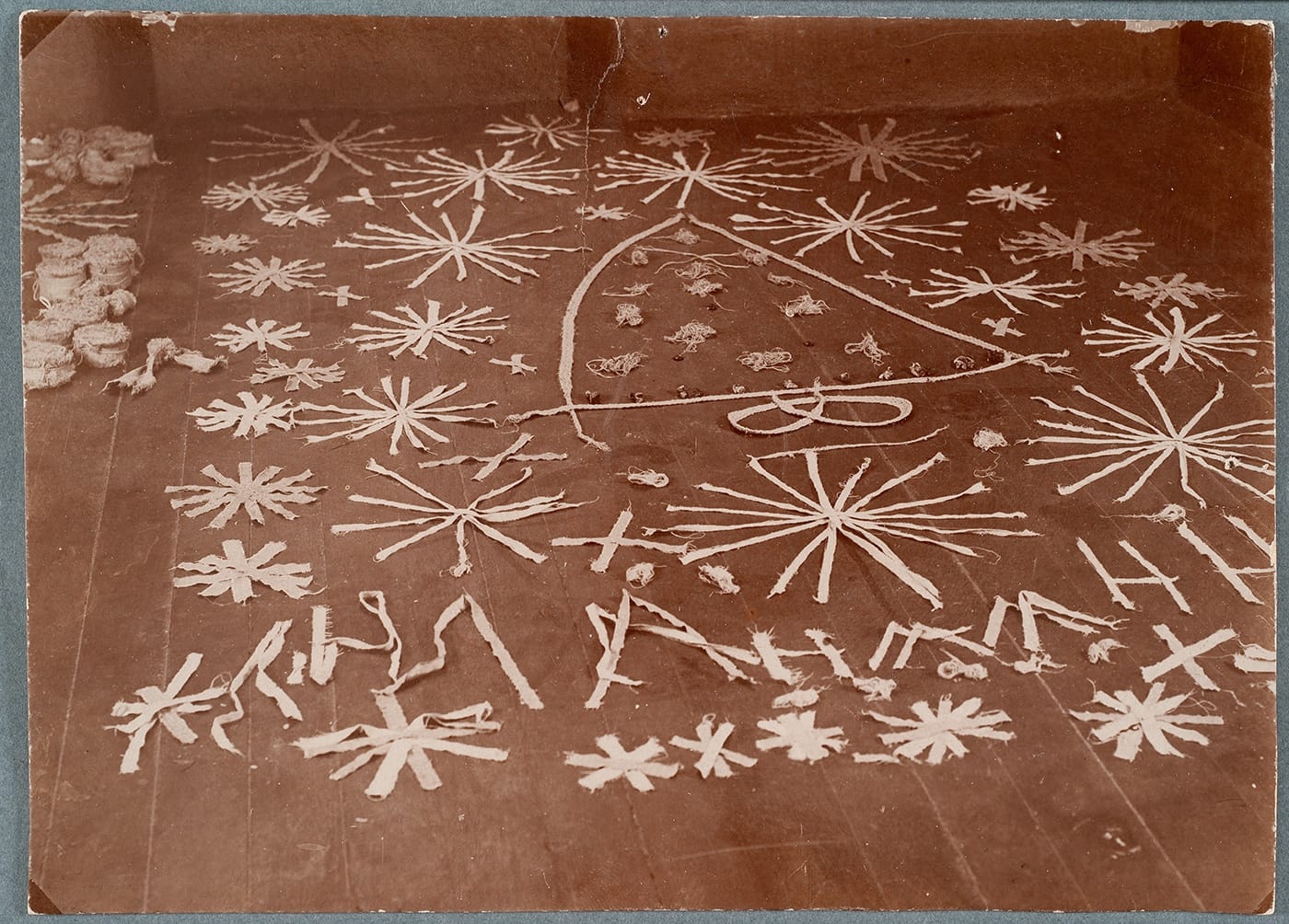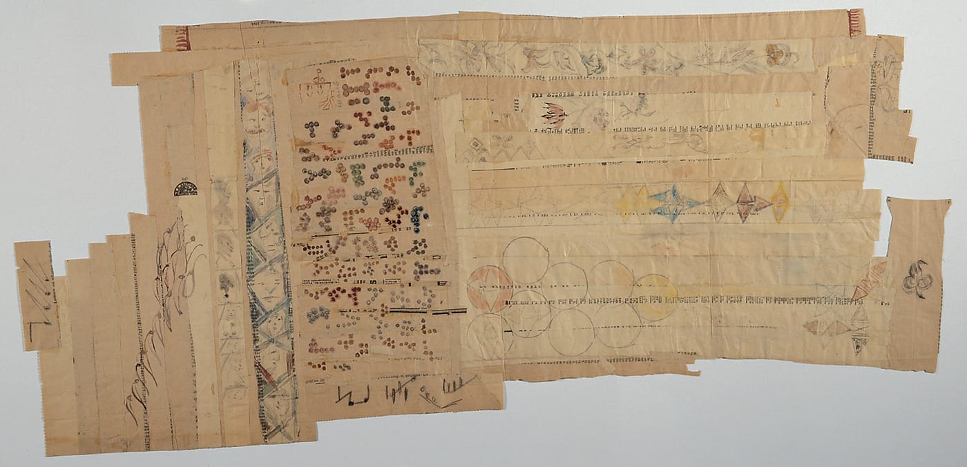 Among numerous pieces from the Prinzhorn Collection, the show includes a tray with a pitcher and a tiny watering can, all made of knotted and crocheted cotton yarn by the German-born Hedwig Wilms (1874–1915), who was diagnosed with, among other ailments, “menstrual psychosis.” Elsewhere, what appears to be a specimen of traditional “women’s work” turns out to be a rather modernist-feeling collage, made of strips of newspapers dated 1890 and 1891, by the Austrian-born artist known only as “Frau St.” (“Ms. St.”). Her creations were preserved thanks to the intervention of an interested professor who sent them to the Prinzhorn Collection in Heidelberg.