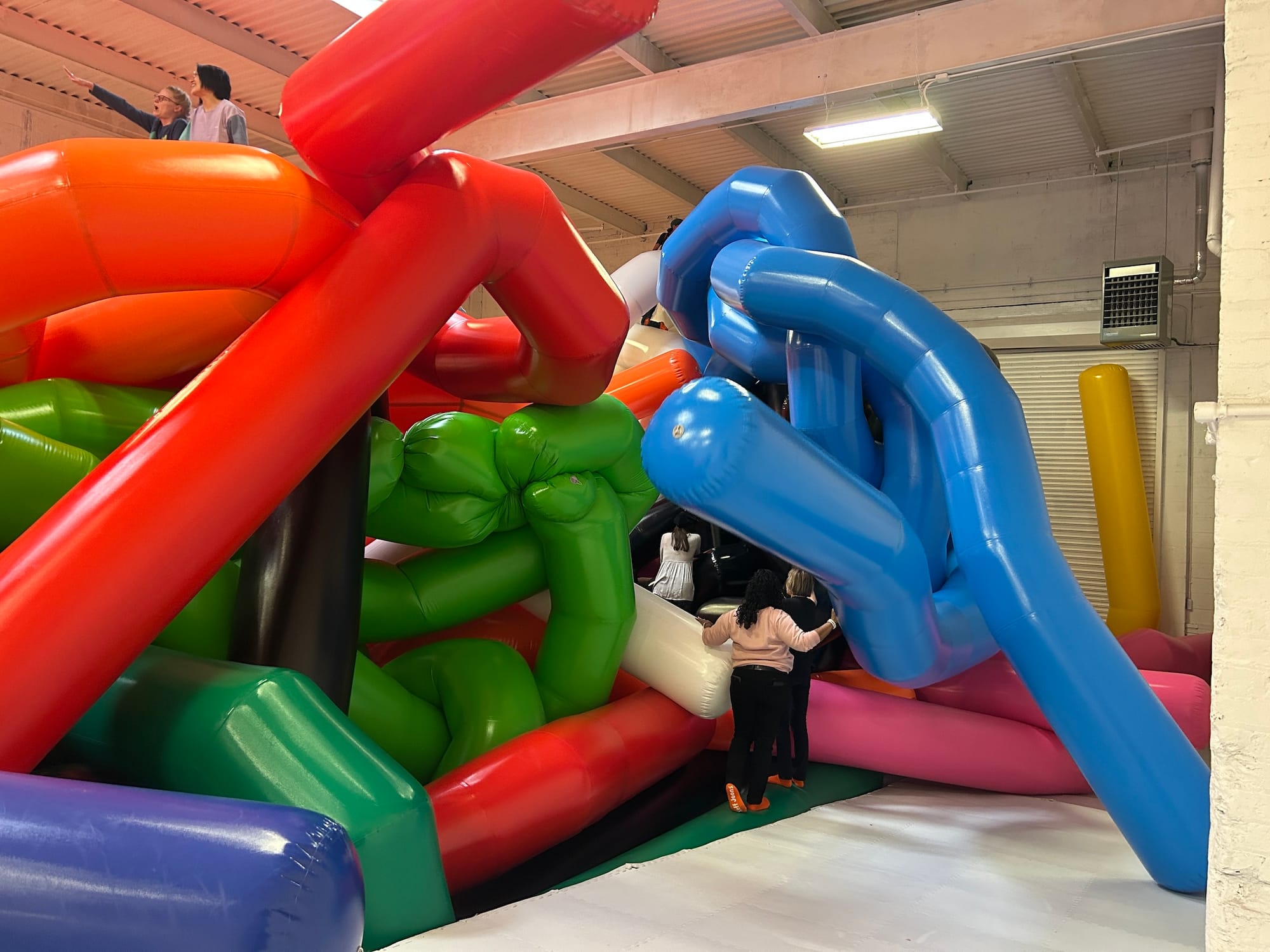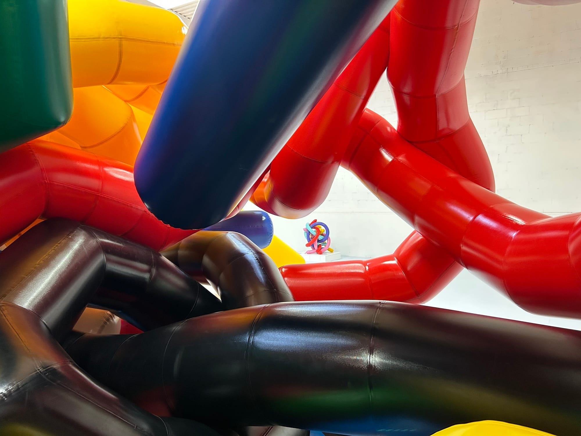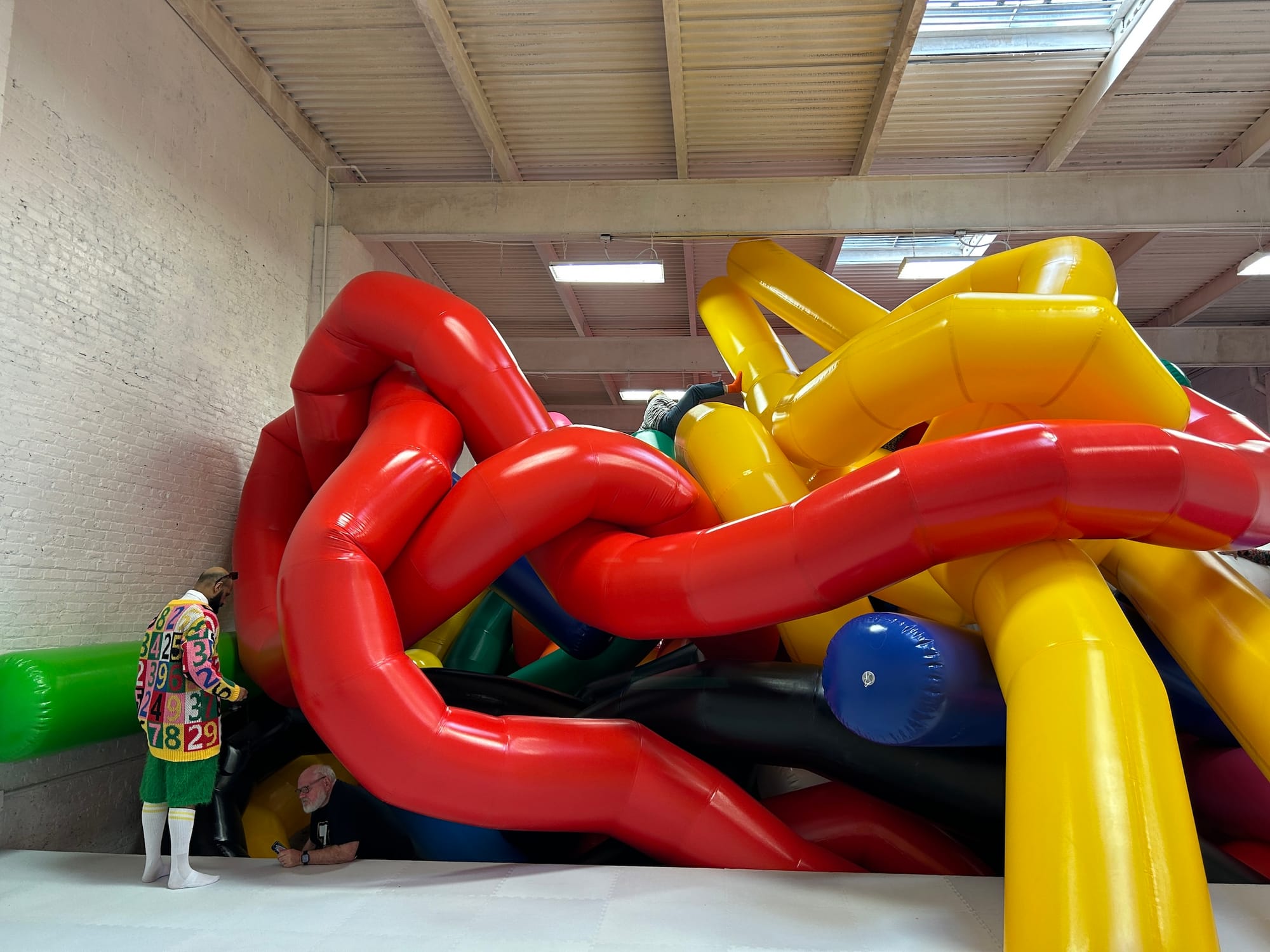 Moments later, as if on cue, two small children and an adult, all wearing socks, rushed into the all-white padded room. The kids made a beeline for the 20-foot-tall mess of air-filled knots and instinctively began to climb an oversized pink tentacle resting on the floor. As their hands and feet made contact with its surface, the blanket of silence was replaced with sounds of squeaking vinyl. The adult asked Tim if he could take a picture before darting away to join the children, who had begun to traverse a labyrinth of blue and white blow-ups.