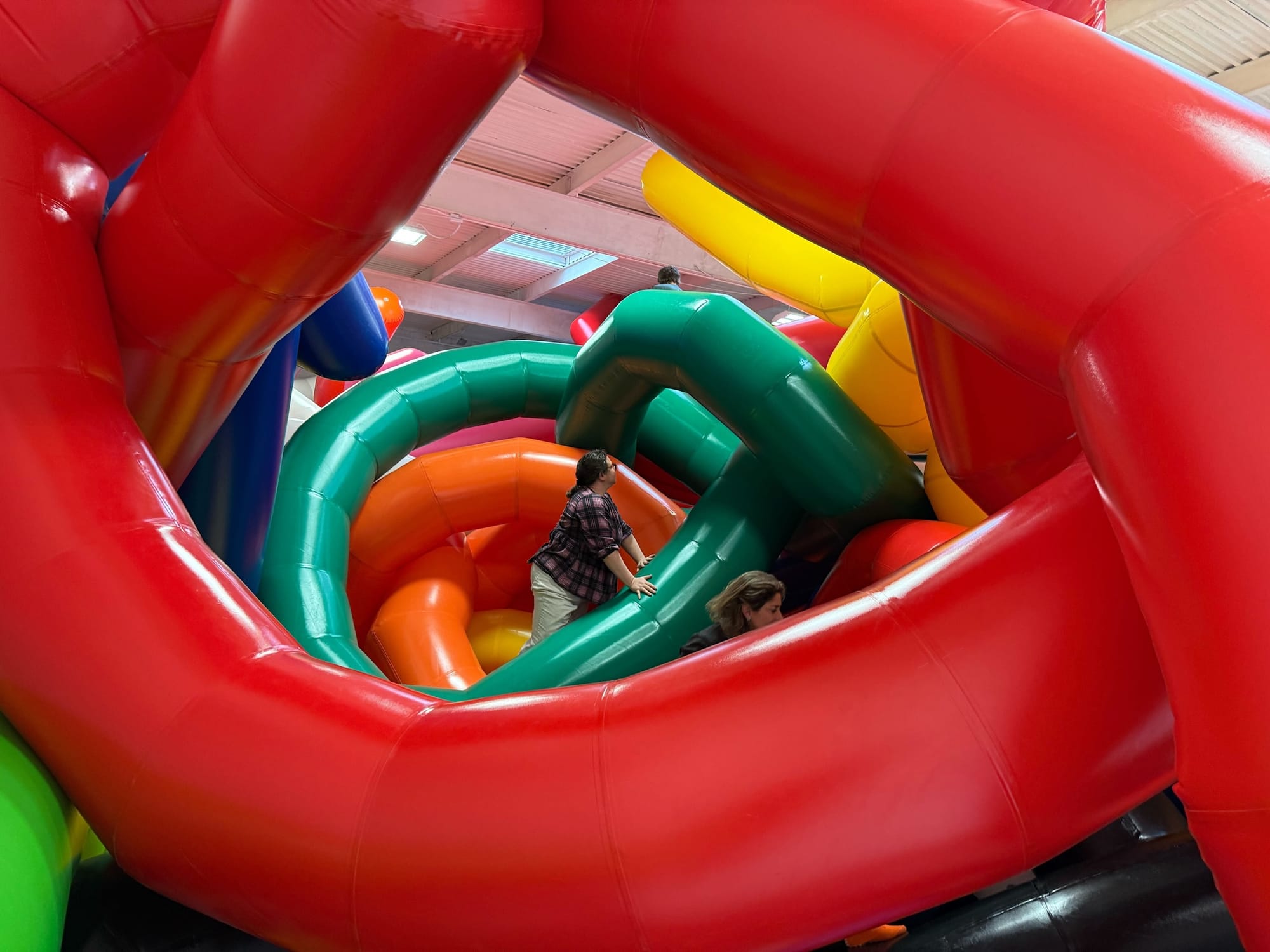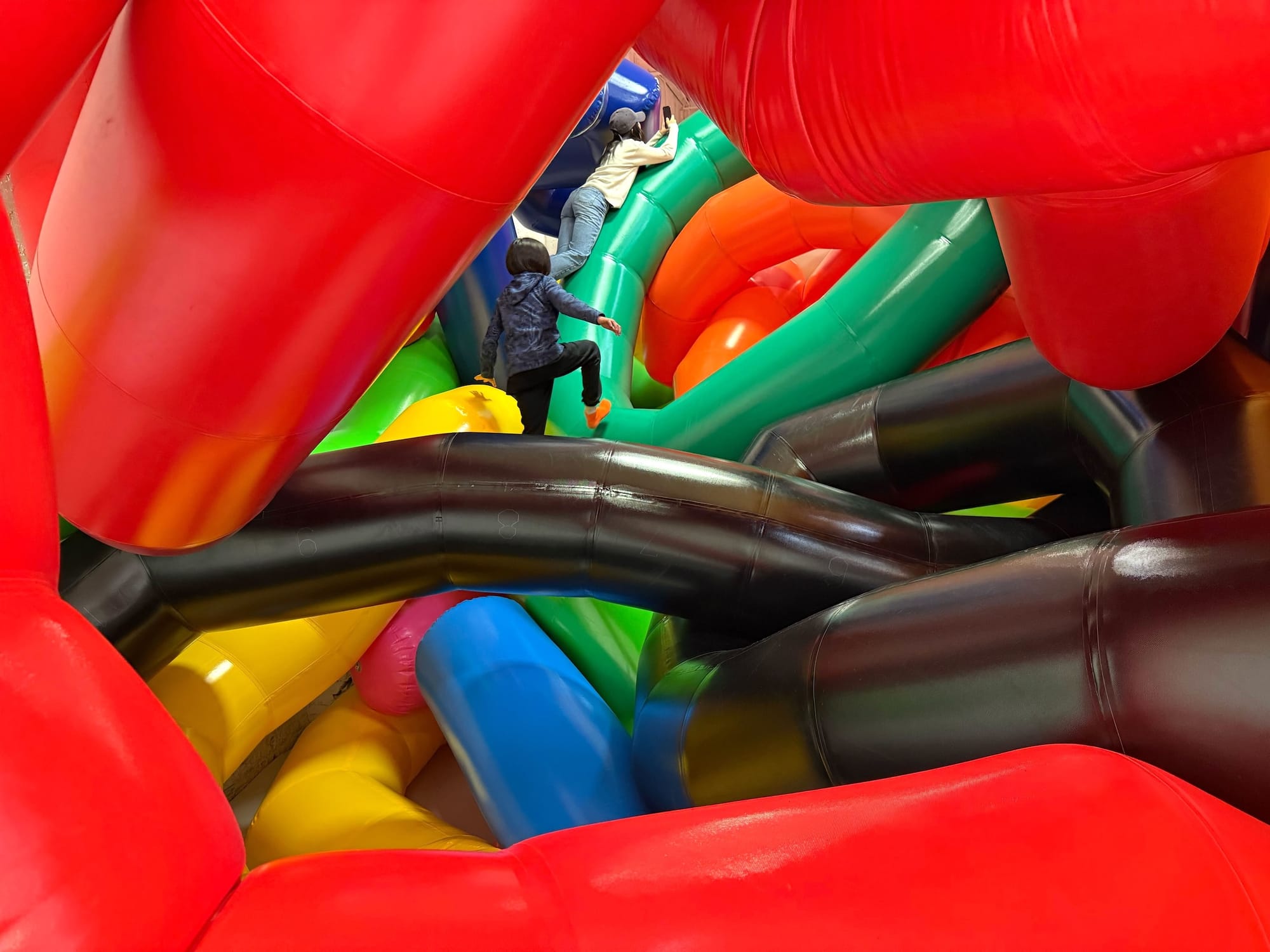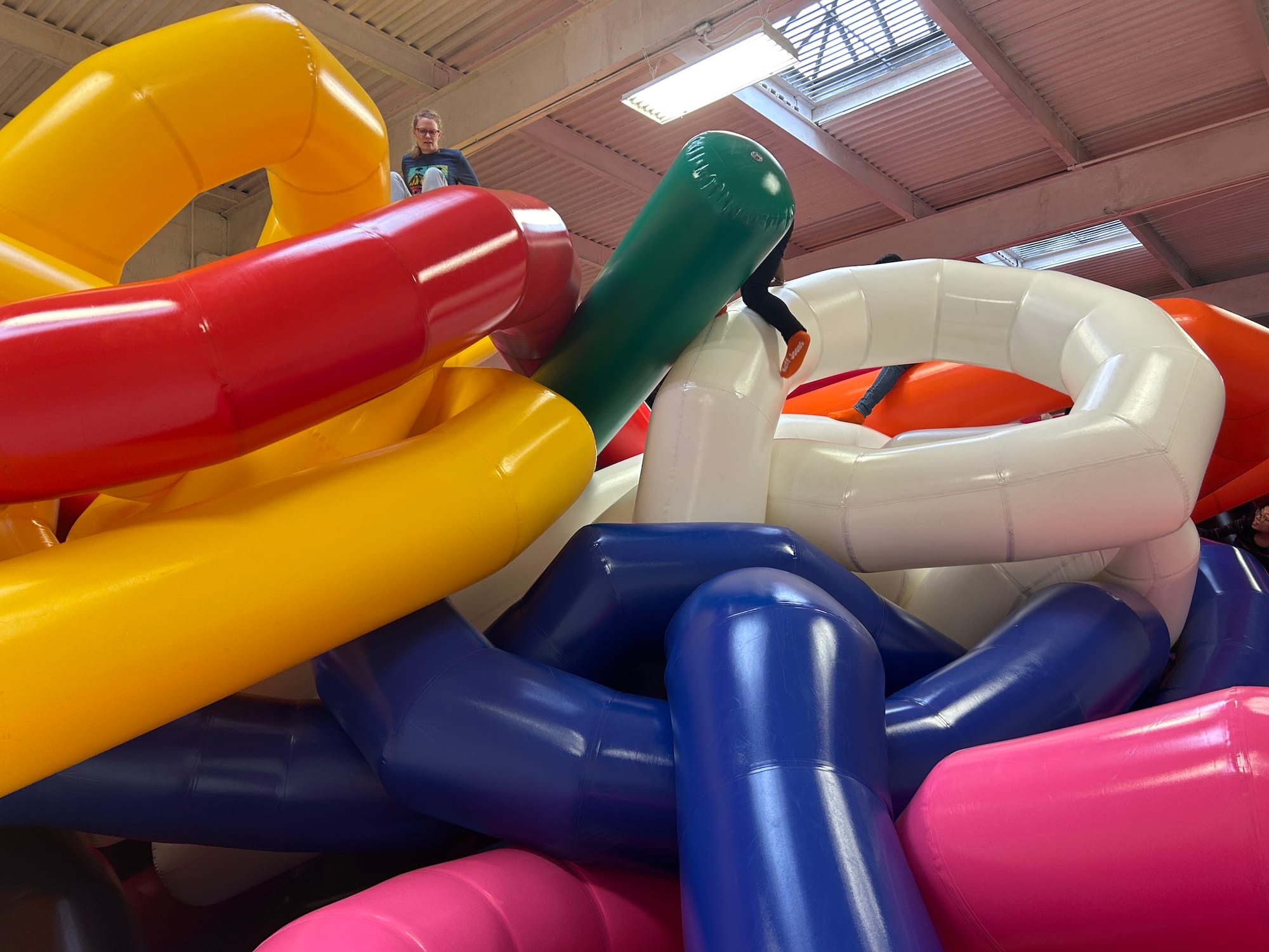 Moments later, as if on cue, two small children and an adult, all wearing socks, rushed into the all-white padded room. The kids made a beeline for the 20-foot-tall mess of air-filled knots and instinctively began to climb an oversized pink tentacle resting on the floor. As their hands and feet made contact with its surface, the blanket of silence was replaced with sounds of squeaking vinyl. The adult asked Tim if he could take a picture before darting away to join the children, who had begun to traverse a labyrinth of blue and white blow-ups.