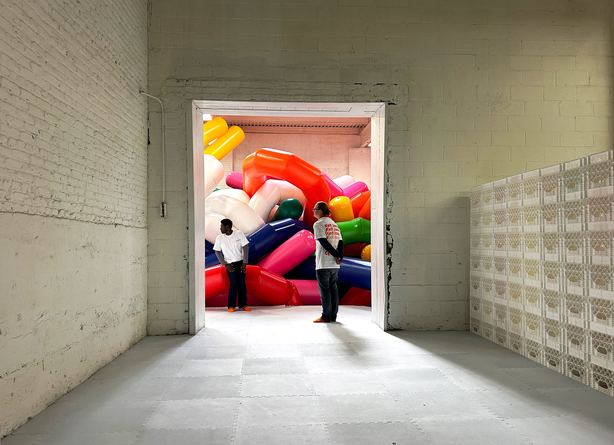 CJ Hendry’s massive inflatable installation, Keff Joons, transforms a seemingly unassuming Brooklyn warehouse into an air-filled rainbow playground.