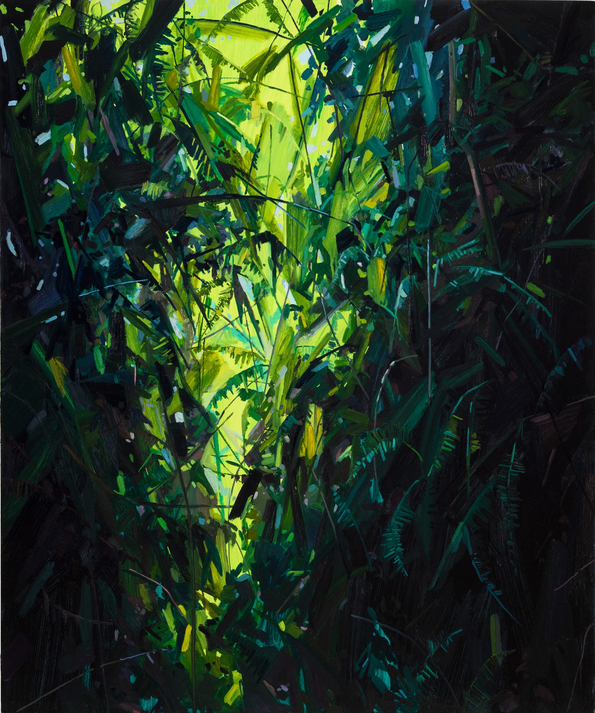 Packed with verdant splays of moss and fern, dark clumps of rock and soil, and tumbling surges of water, the large-scale landscapes in Claire Sherman’s New Pangaea at DC Moore Gallery, convey, in their shadowy overgrowth, the sense that something is hidden. In “Leaves and Vines” (2017), an allover thicket of jagged, mossy green brushstrokes admits, like a curtain left a crack open, a wedge of sun-brightened foliage. In “Holes” (2017), two indistinct dark patches beckon amid an otherwise dense underbrush. The low vantage points of both “Waterfall” paintings (2018, 2019) allow dusky cliff faces to occupy the bulk of both compositions, leaving visible only a sliver of tree-filled daytime sky toward the top of each canvas. Even in the more aerated compositions, where larger sections of sky peek through the bramble, a mysterious fog hangs over the scene, as in the ashen swoops of paint that form the gauzy background of “Vines” (2019).