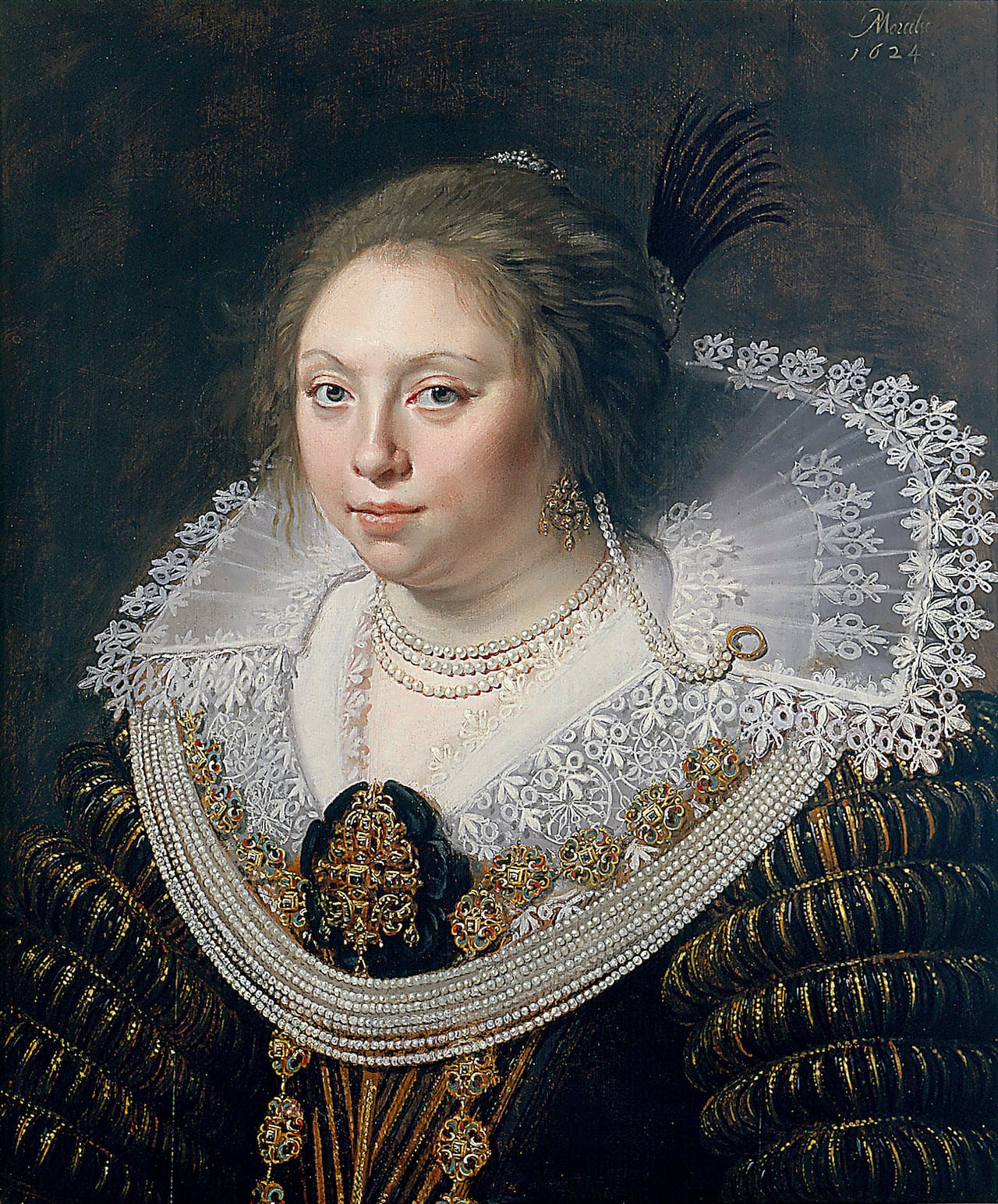 The exception is the portraits of nobles, who simply insist upon occupying the first rooms of the exhibition hall. It had been the task of monarchs to raise families to the nobility, and the Dutch had just dispensed with theirs, throwing off the domination of the Spanish Hapsburgs at the end of the 16th century. This left the noble class on the wane in numbers if not in strands of pearls, stiff lace collars, and pneumatic sleeves, as Paulus Moreelse’s “Portrait of Ermgard Elisabeth van Dorth” (1624) demonstrates. Soon enough, rich merchants rushed into the void in the upper class, nobles in everything but title. Bartholomeus van der Helst painted the portraits of more than a few of these aspirants, his work perhaps valued for his uncanny ability to bring more life to their rich clothing than to their faces, as in “Portrait of Abraham del Court and his wife, Maria de Kaersgieter” (1654).