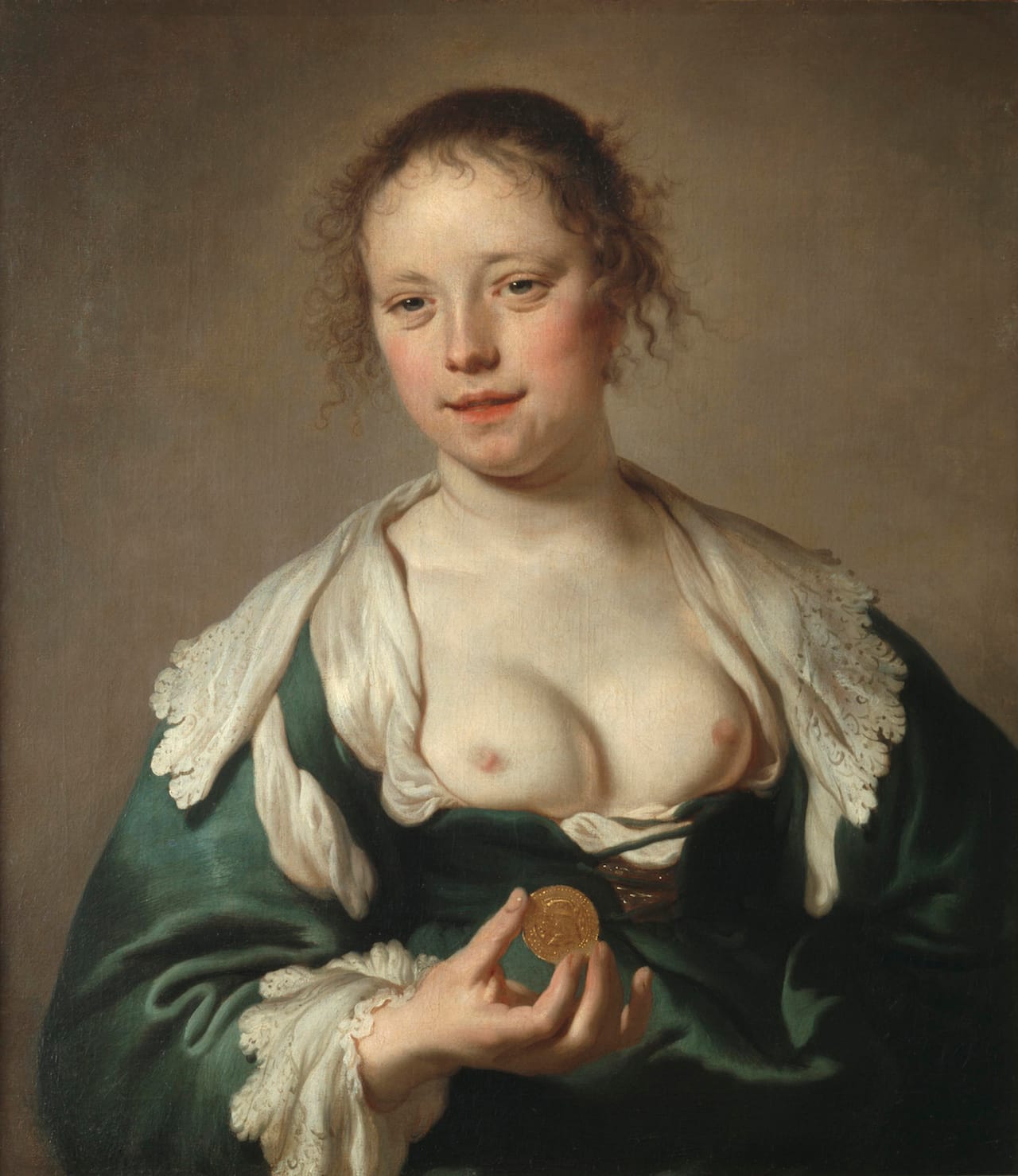 Scattered around this painting like minor satellites, a series of smaller canvases depict people at work in some of the professions available to inhabitants of the new republic. Women tend the store and the home, expressing domestic virtue in the nearly-lost language of tidy hearths, pliant children, and clean linens, while men go to soldier, perform minor surgery, notarize documents, and sound a horn to alert us to fresh-baked bread. All of these professionals are locked in the grid of interior architecture, graphed distinctly into their spaces — with the exception of Jacob Backer’s “Half-Naked Woman with a Coin” (1636) who nearly springs out of her frame like her breasts from her bodice, holding up her price tag.