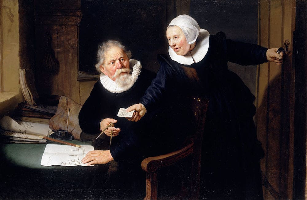 For kicks, head straight from “A Lady Writing” to Rembrandt’s “Portrait of the Shipbuilder Jan Rijcksen and his Wife” (1633) in the next room. The young woman’s light touch on her note in the Vermeer is replaced in the Rembrandt by the wife’s hearty grip on a business dispatch, rushed into the husband’s office. There is no leisure here; the size and mastery of Rembrandt’s painting itself measures the fruit of the couple’s labors. Rembrandt’s muscular brushwork follows the contours of the figures, hewing out the illusion of space in the simple wood-lined room. Rembrandt’s facture could not be farther from Vermeer’s seemingly touchless glazes, nor the beribboned curls of “The Lady Writing” from plain-bonneted head of the shipbuilder’s wife.