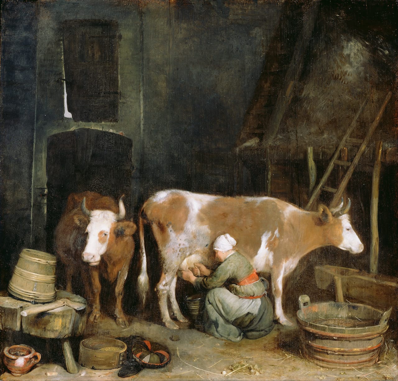 These neatly gridded spaces for the most part give way, in the section reserved for laborers and the indigent, to outdoor scenes, rundown barns, and shabby outbuildings. In “Maid Milking her Cow in a Barn” (1652–4), Gerard ter Borch renders such a space in all its evocative contingency, like the way the ladder to the hayrack tilts just so, hooked onto a post. Ter Borch’s work appears elsewhere in the show, including a pair of drolly vacuous portraits of burghers, miniaturized into ciphers of prosperity, and the elegant fantasy “Lady at her Toilette” (c. 1660). But in this canvas he trades the patricians and the satin-clad lady for a milkmaid and very sympathetic cow, placidly awaiting her turn to be milked.