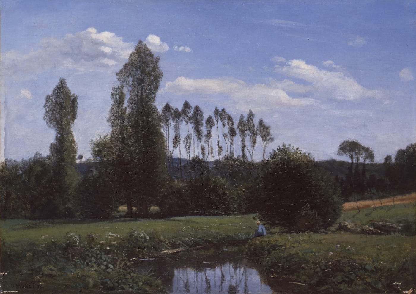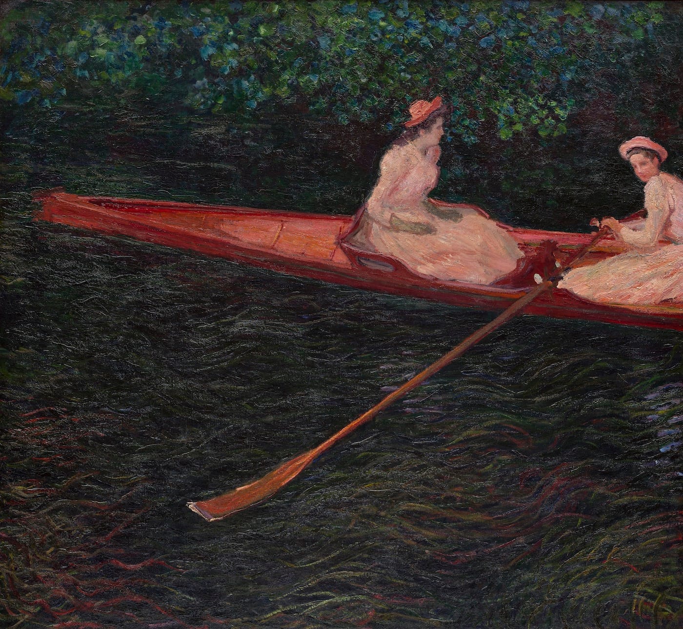 The richness of nature is indeed present across Monet’s oeuvre, and makes for a lush and absorbing show. Few paintings are peopled, with exceptions like “Boulevard des Capucines” (1873-74) and “The Canoe on the Epte” (1890) casting the emptiness of other works in sharp relief. An early “View from Rouelles” (1858) testifies to the young Monet’s mastery of verisimilitude — a fixation on realistic rendering that he disengaged as he developed the style for which he would become famous; a turn towards loose brushstrokes unfolds as the exhibition progresses toward Impressionism proper.