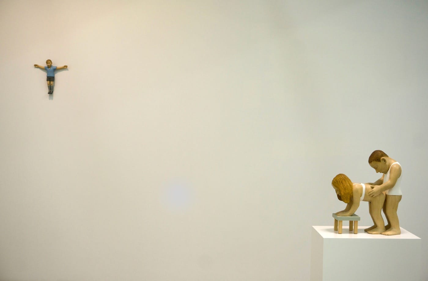 Another potent relationship is between the pieces entitled “Little Table” (2018 and “School Days” (2019) “Little Table” portrays a man and woman in the act of sex, the woman bent over forward and leaning on a literal, little table as the man enters her from behind. His head lowered, his expression passive, as is hers. The vibe is one of obligation, rather than passion. The piece is set off by a very small sculpture of a crucified little boy that hangs near them on the wall. The lad in “School Days” appears to be wearing a school uniform, Catholic school perhaps? The juxtaposition of these two sculptures creates a narrative that sets up pieces of a story, but each viewer must provide their own ending.