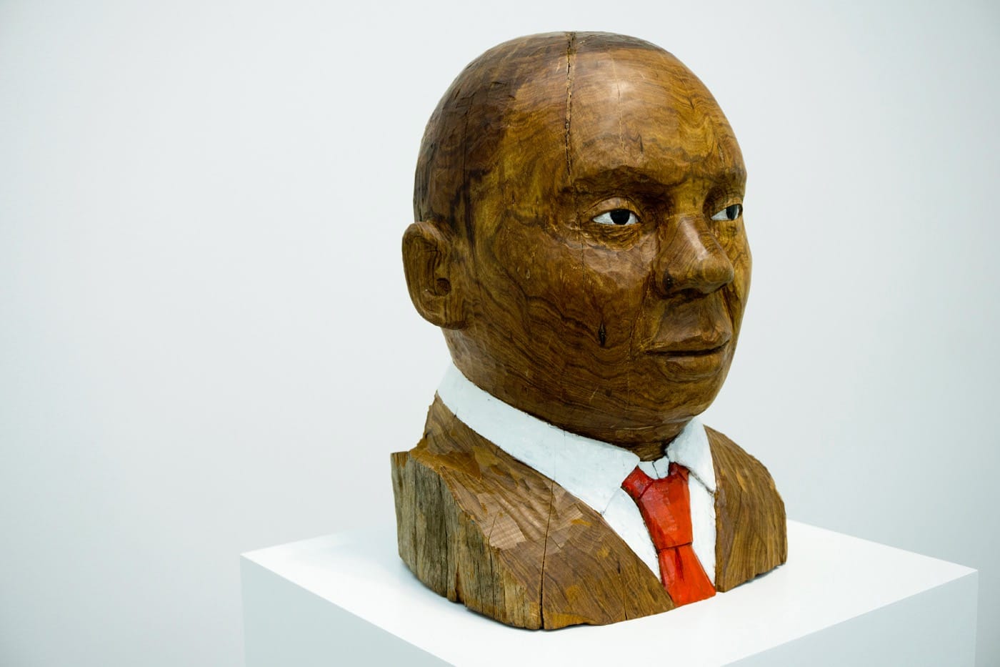 All the figures in the show are of European origin with the exception of a large formal bust of a Black African man. Simply entitled “The President” (2019), it is, according to the gallery, a portrait of the current South African President, Cyril Ramaphosa. It is an odd intrusion of the outside world into Schreuders’s dreamscape. Perhaps this is a brash reality check about the possibility of real intimacy or privacy? (The government is always watching.) This sculpture is carved out of teak and the wood is obviously rougher and darker. The artist’s carving is bolder than in the other pieces, the deep gestural carving marks enhancing the beauty of the teak. The artist has left the sides of the bust raw, exposing that this is carved from a large block of wood. The figure sports the same passive expression that permeates this show, but her looser carving imbues the bust with a more robust energy.