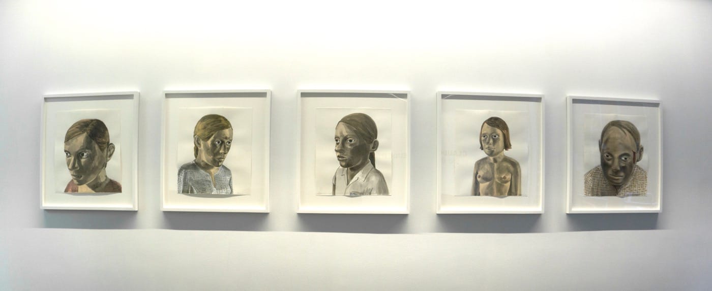 Her most recent show at Jack Shainman Gallery entitled In the Bedroom is perhaps both her most revealing and most enigmatic body of work to date. The title hints that viewers will be privy to something intimate. It’s a little titillating, a tad seductive. Yet once you enter the gallery the first thing you see is a wall hung with five drawings, displayed closely together. Drawn in acrylic ink on paper, the five create a powerfully ominous narrative (all of them made in 2017). Entitled (in order) “Mingle” — a close-up portrait of a very intense adolescent boy staring intensely to the left, outside of the grouping. Next to him is “Note to Self” — a young woman staring blankly to her right. She is faced by “Anna in Uniform,” — a young woman with a traumatized expression staring to the left. She is next to “Loved Ones” — a young girl, topless with pre-pubescent breasts. Her body faces us, but her head turns away looking into the distance. This jovial grouping is punctuated by “The Neighbor” — a middle-aged man grimacing angrily as he stares back at the group, a bloody wound on his forehead. Everyone is avoiding meeting each other’s eyes, as well as ours. This is a portrait of intimacy of the most terrifying sort. Whatever psychodrama has happened here feels like the stuff of the morning tabloids.