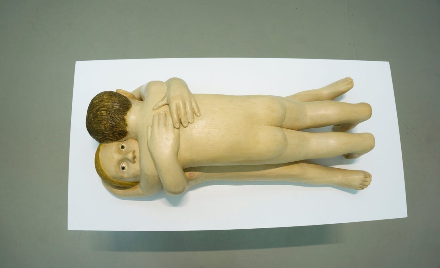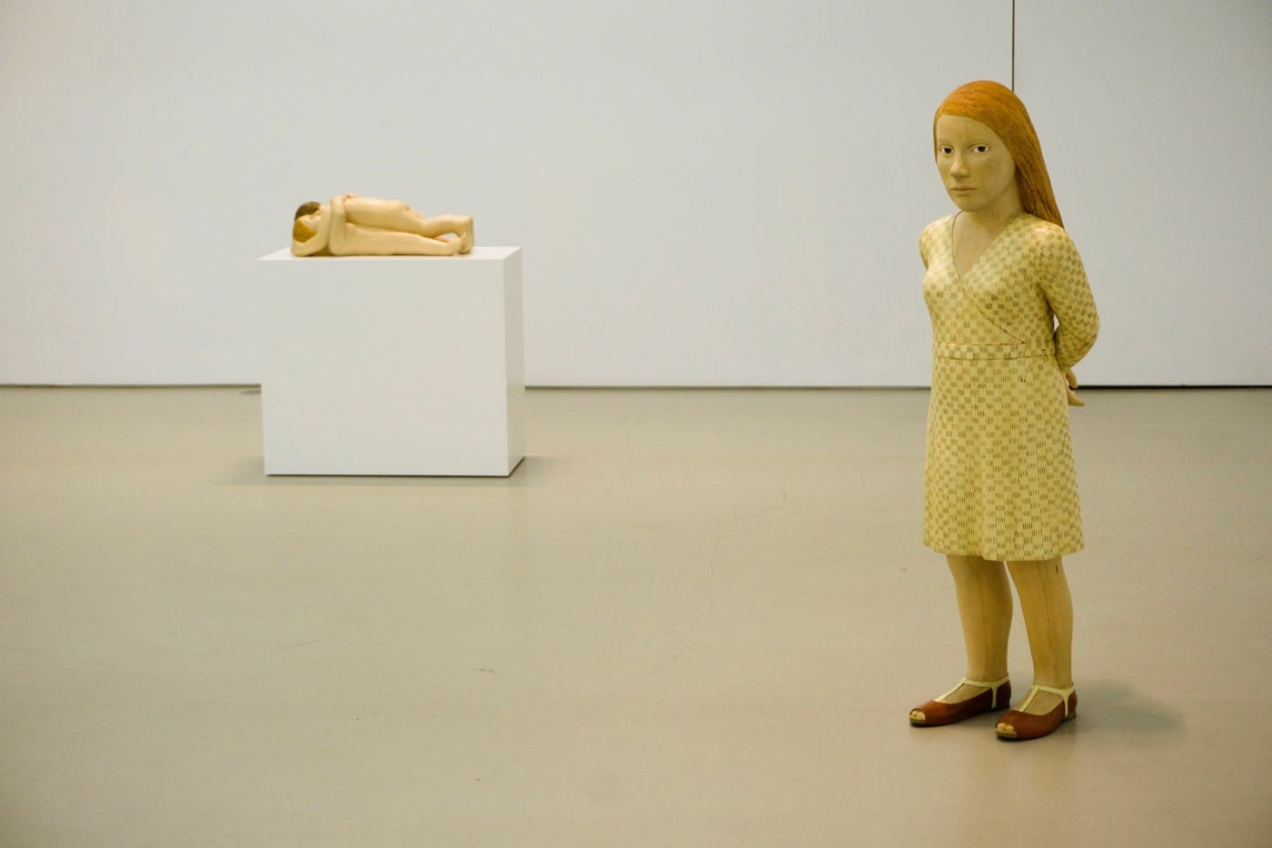 Schreuders carves her sculptures from Jelutong wood, a type of rubber tree found in Asia. It’s a soft wood, buttery yellow and smooth grained. The carving marks show, but softly, giving the works an air of gentility. The materiality is obvious, but the edges have been smoothed. The sculptures are painted in mellow, muted colors. Everything is just fine … which to me makes the depth of the psychological content all the more strange and powerful.