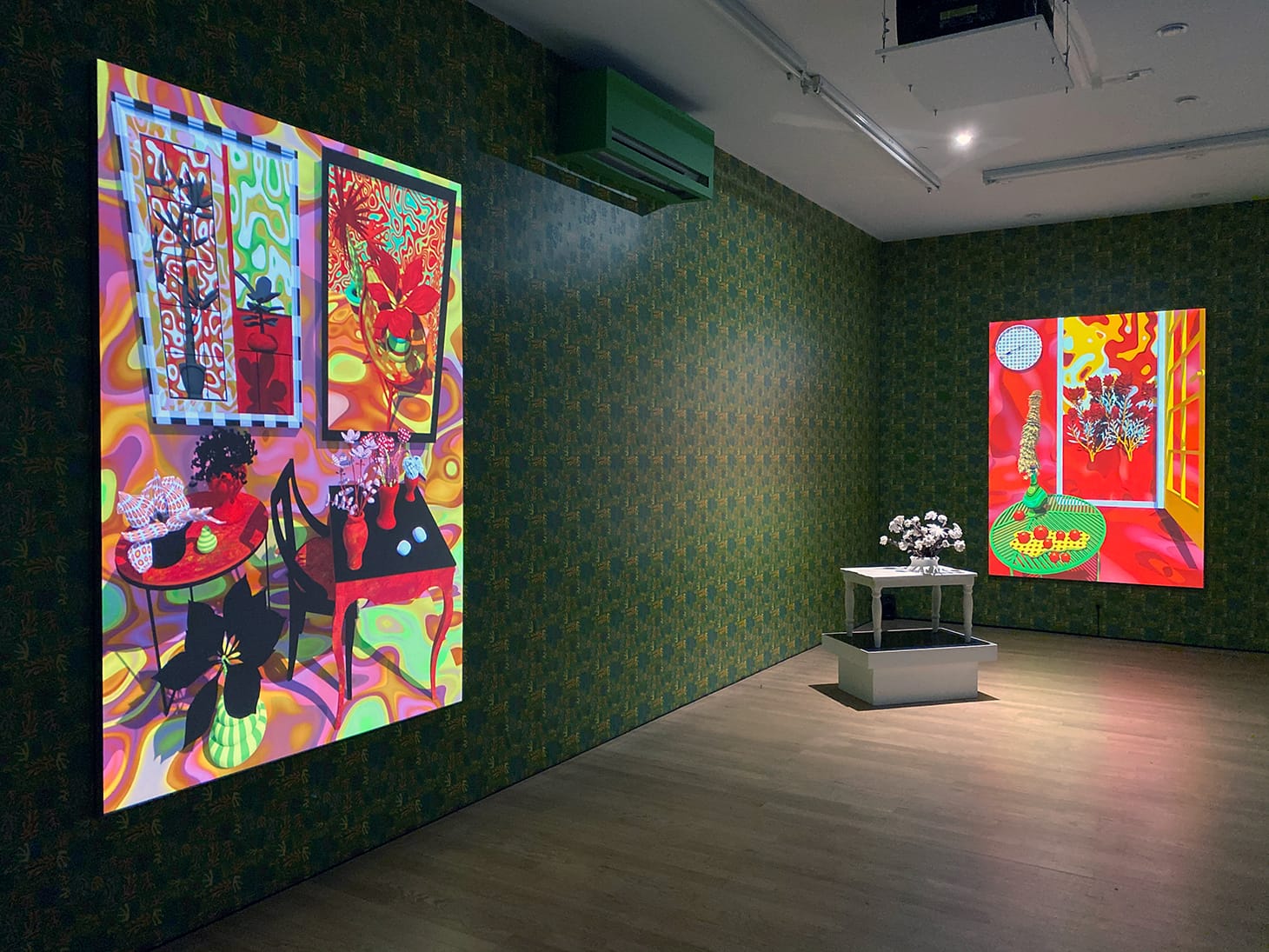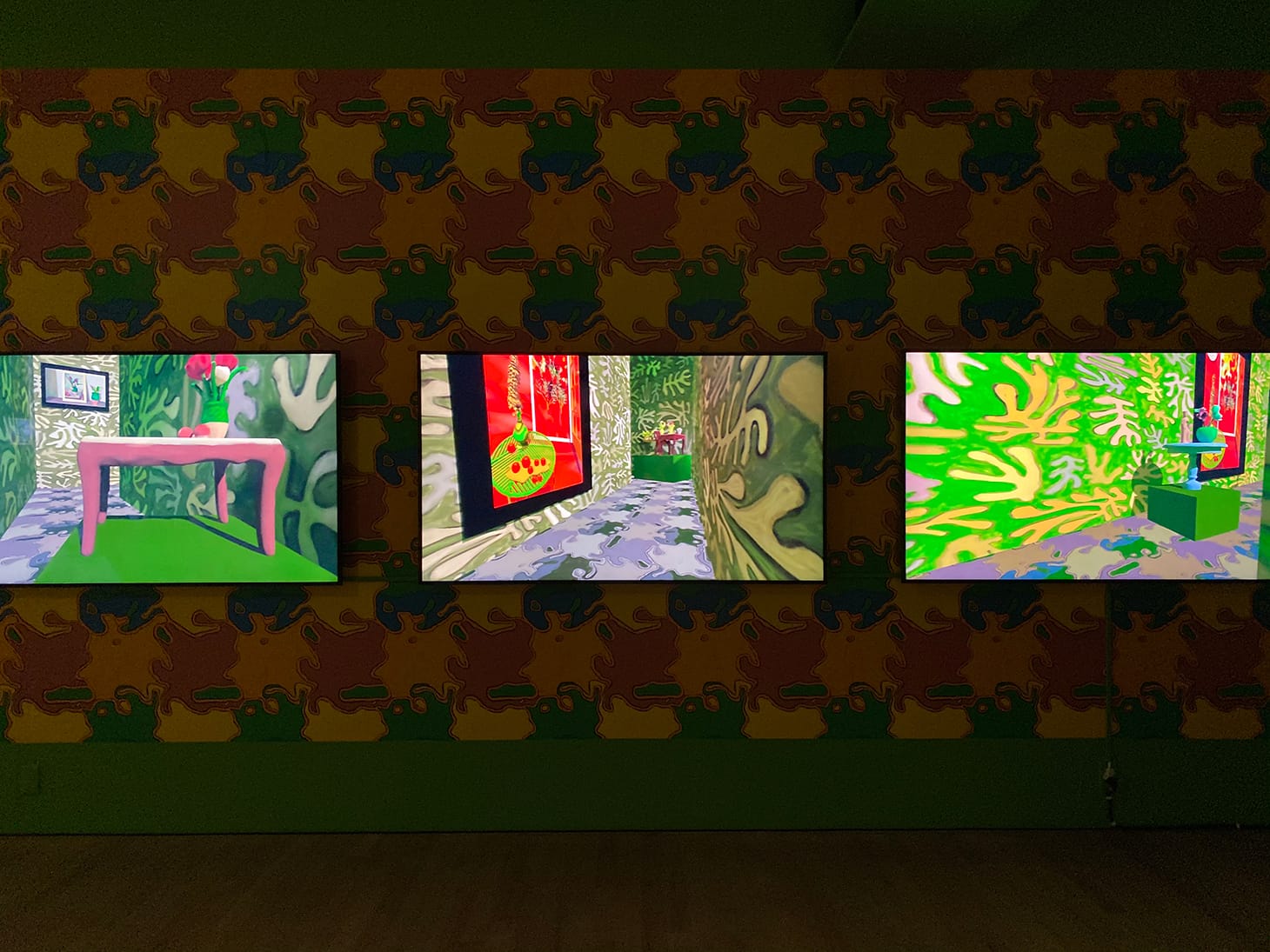 In the larger, Matisse-inspired digital works that dominate this solo exhibition, Hart references a number of his well-known Fauvist paintings, but knowing the references doesn’t feel essential. Their five-minute loops imbue a quiet and calm quality that suggests a meditative space. The plants sway but never grow, the clocks turn with their own rhythmic pace, refusing to tell time but conveying a sense of it nonetheless. The scale and rectangular formats recall windows, which also evokes a favorite trope used by Matisse in his art.