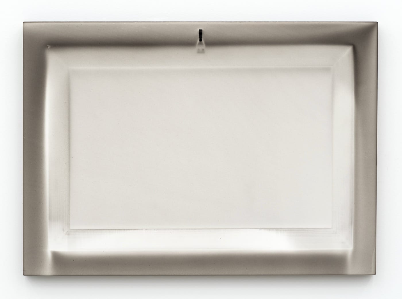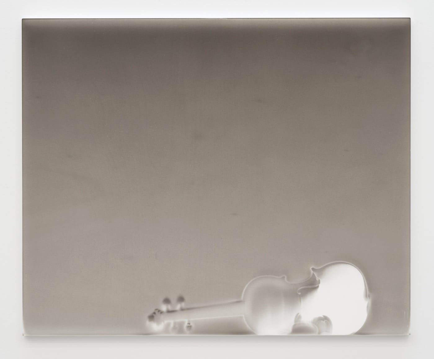 There is an untitled image of a lonely violin set on its side, and in another work also untitled, the simple frame of a rectangular art piece that once occupied a wall. Both images are signs denuded of all other information except their outlines, to leave the thing itself even further away from my hands than is typical in a gallery context. There are entire shelves of spectral vases entombed in ash — all the works in the exhibition are untitled and dated 2017, except for two that are dated 1975. It’s a poetic bit of irony that Parmiggiani worked as an assistant for Giorgio Morandi in Bologna for two years. Morandi’s practice, in contrast to Parmiggiani’s, was very much about the still life, seeing the thingness of the objects arranged carefully. Morandi’s work explored the varicolored permutations that vases and bottles could take on in his imagination and the light that entered his studio. Here the objects leave only an impression, something said in a storm that the wind took away.