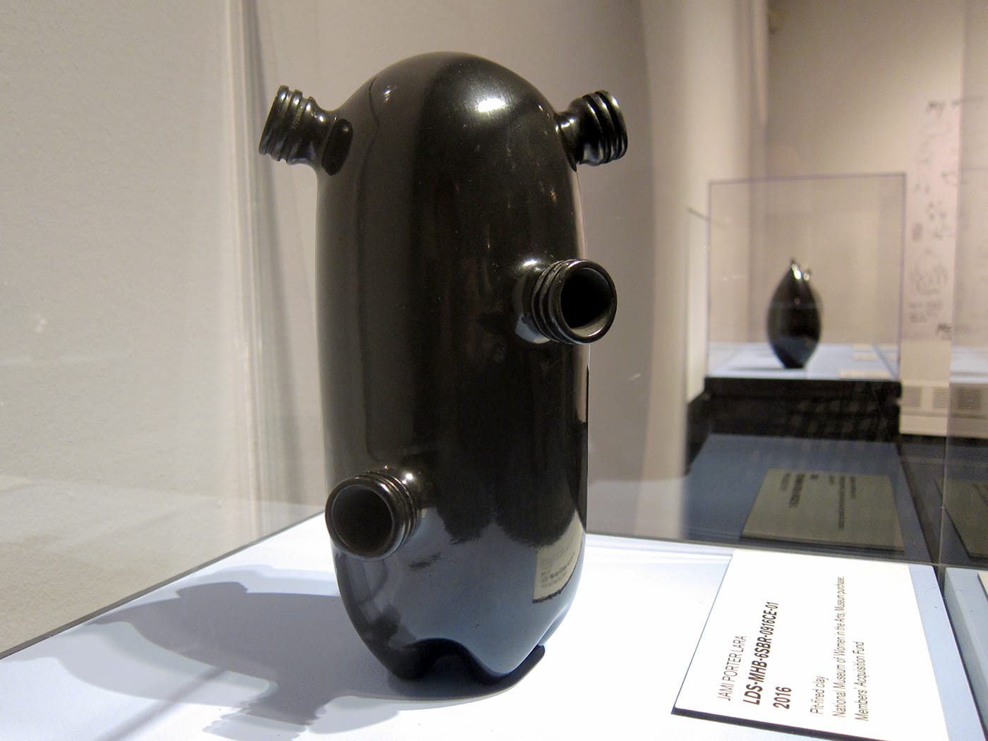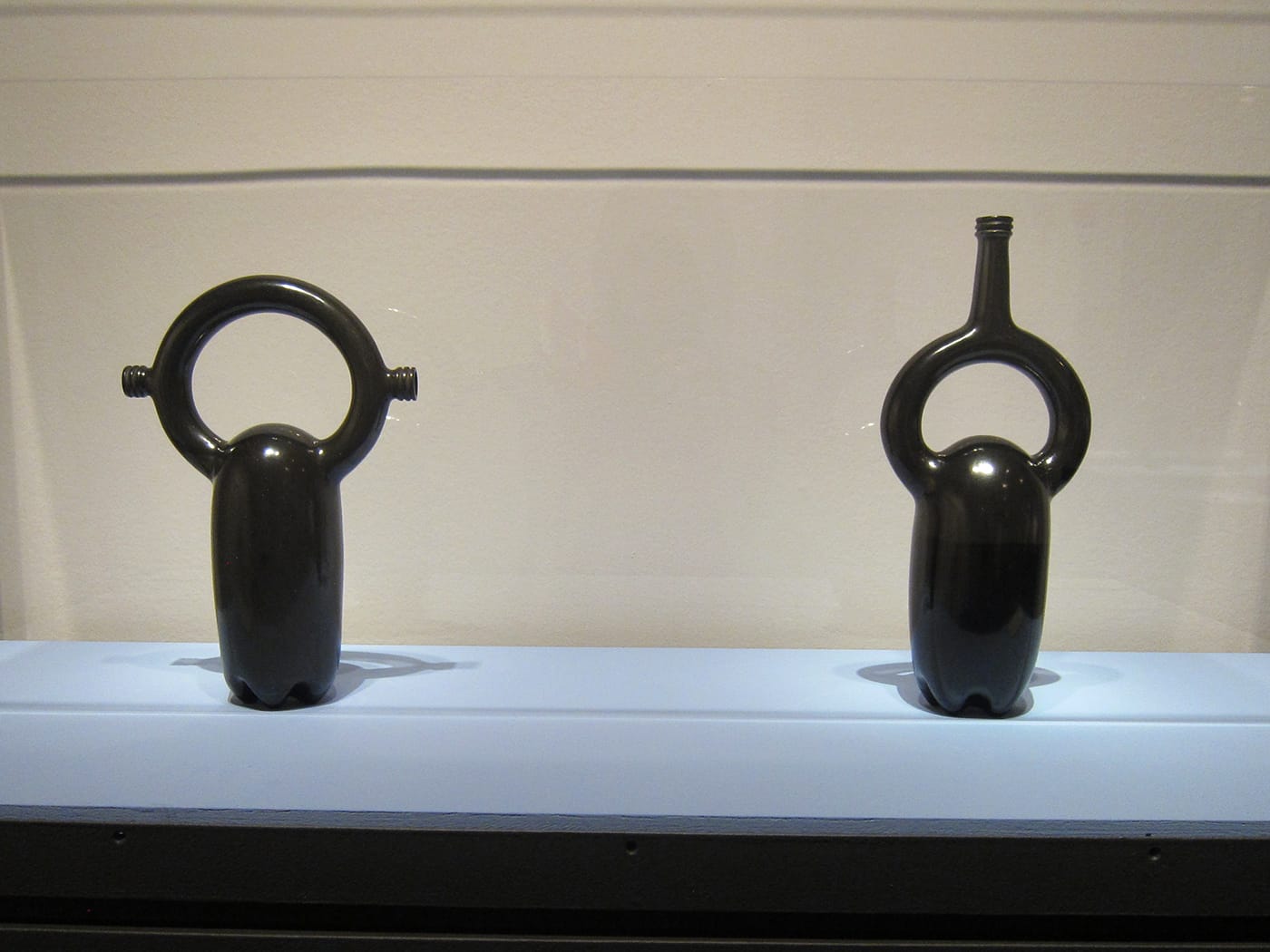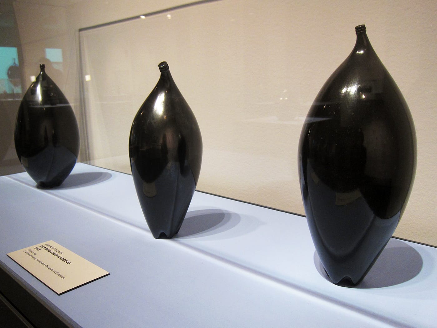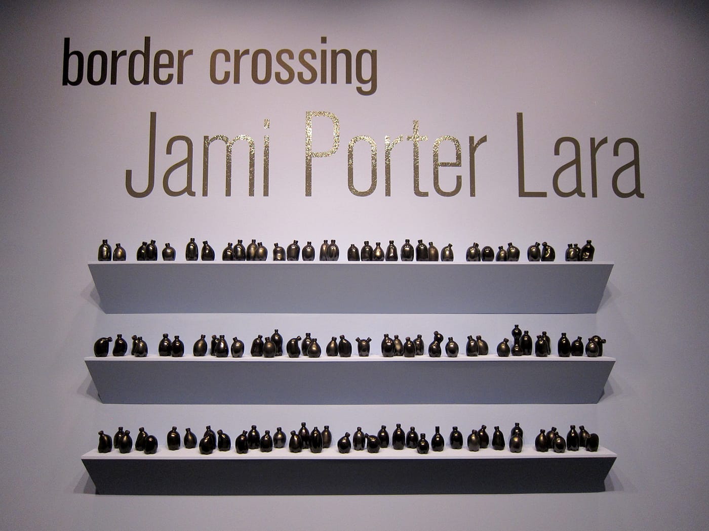 WASHINGTON, DC — A pair of gourds, a uterus, and the rudder of a boat — these are some of the objects that Jami Porter Lara‘s slick, black sculptures immediately bring to mind. As varied as they are, their forms all descend from that of the common plastic water bottle. Twenty-five are currently on view at the National Museum of Women in the Arts in the Albuquerque-based artist’s solo exhibition Border Crossing, curated by Virginia Treanor.