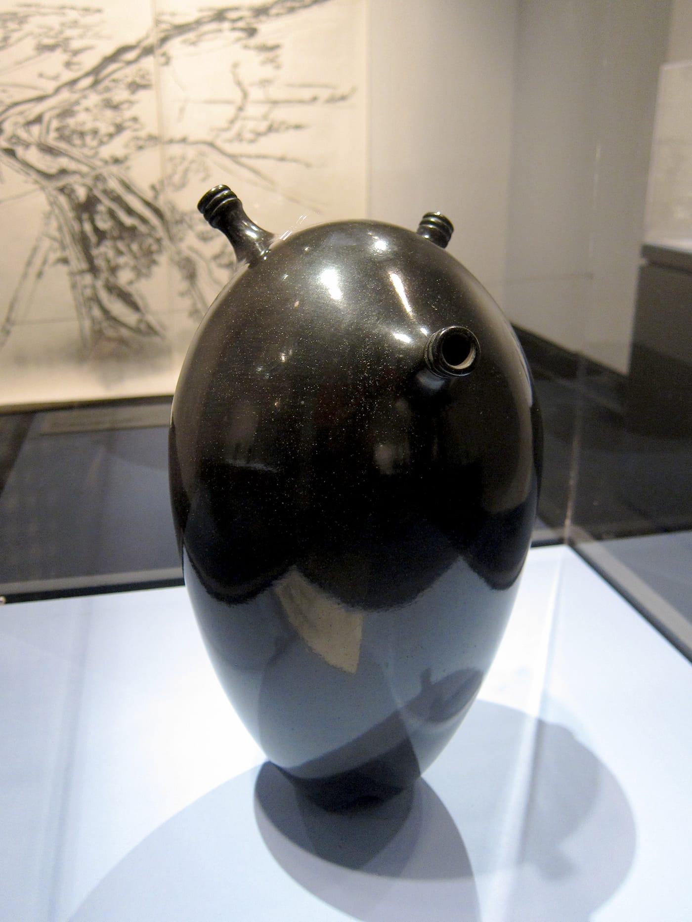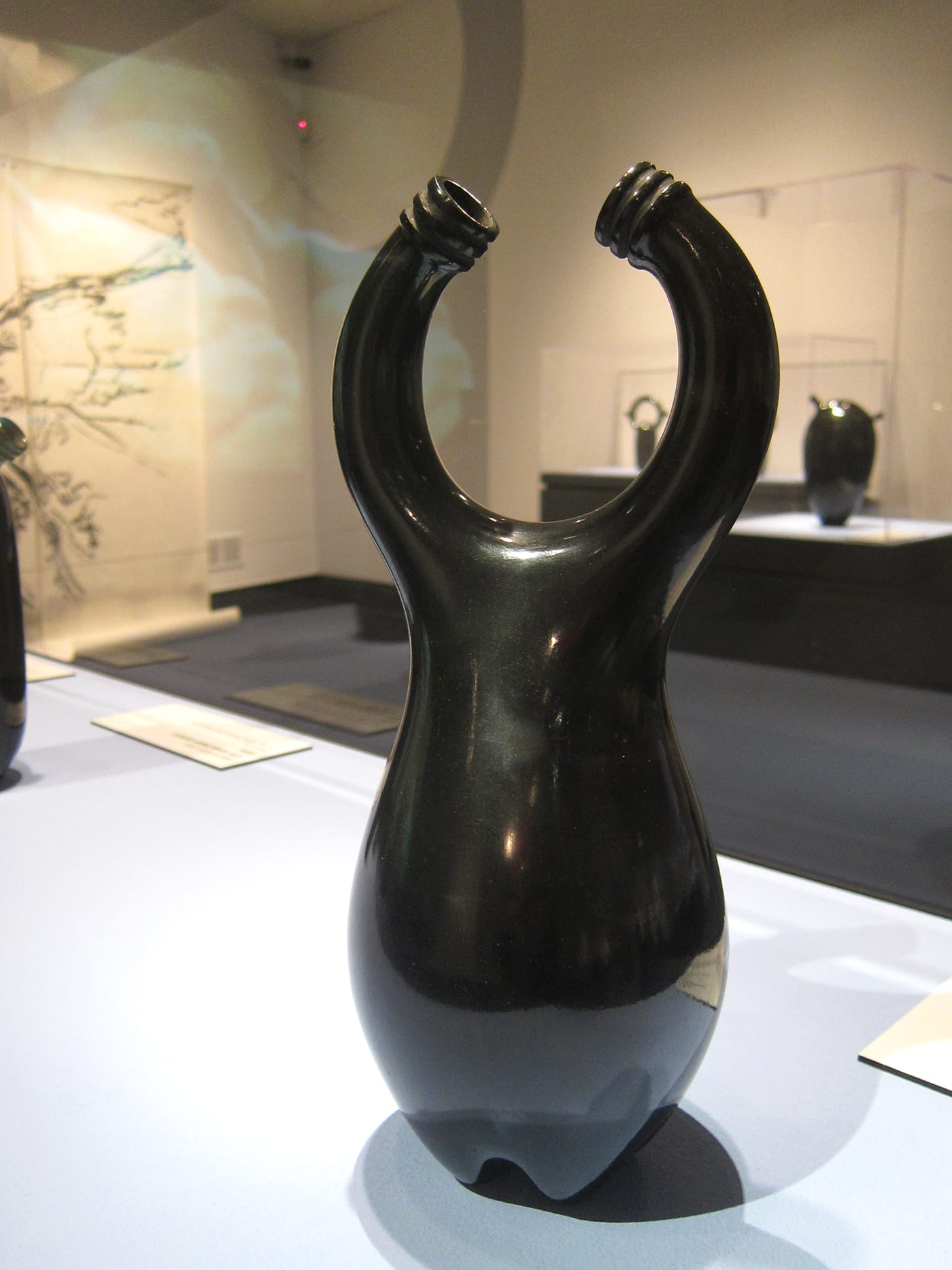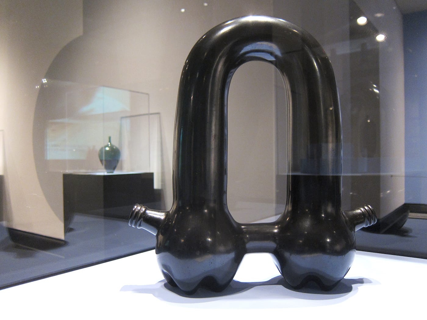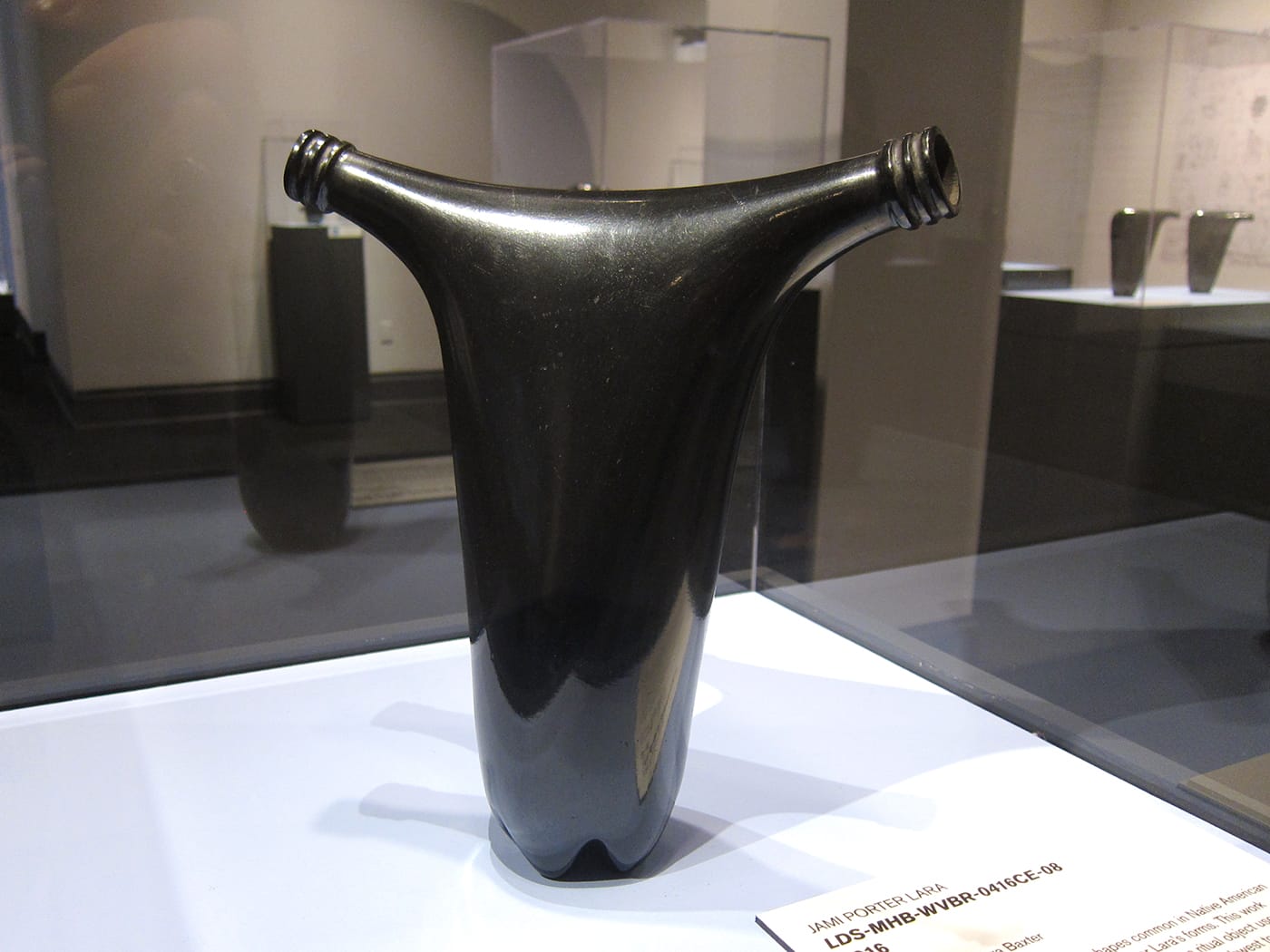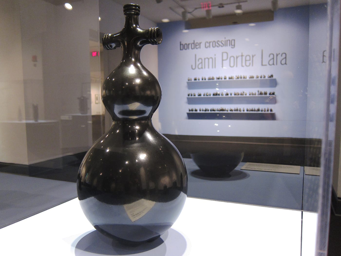 WASHINGTON, DC — A pair of gourds, a uterus, and the rudder of a boat — these are some of the objects that Jami Porter Lara‘s slick, black sculptures immediately bring to mind. As varied as they are, their forms all descend from that of the common plastic water bottle. Twenty-five are currently on view at the National Museum of Women in the Arts in the Albuquerque-based artist’s solo exhibition Border Crossing, curated by Virginia Treanor.