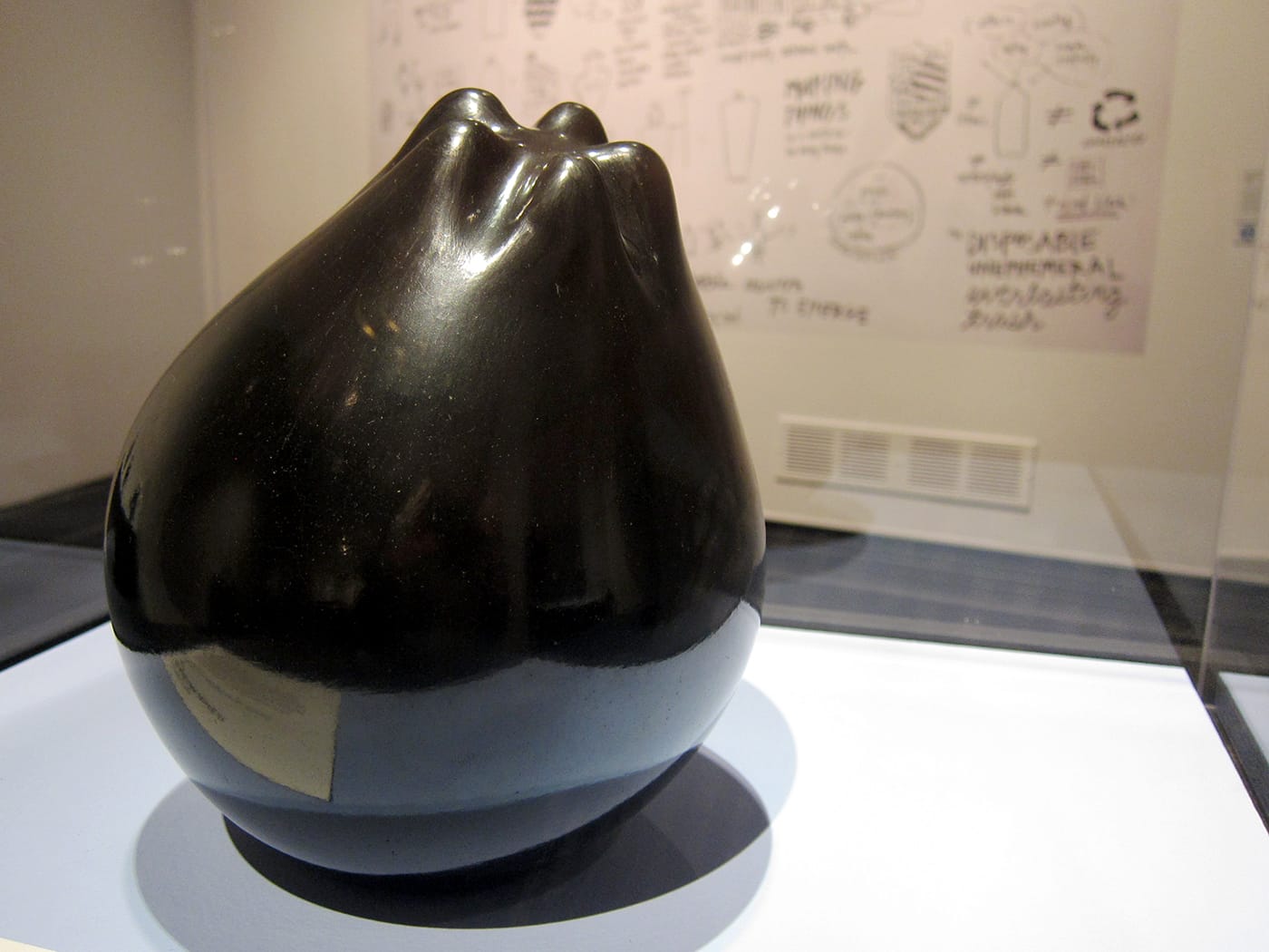 Although new visions of a time-worn object, the sculptures are all rooted in the past through Porter Lara’s use of a millennia-old process. In 2011, she was living with potters in Mata Ortiz, who taught her traditional techniques of hand-building and pit-firing clay, found from nearby stream beds or mountains, into pottery. Each of her works is the result of this precise craft, which she explains in a video in the gallery. Although their smoothness and symmetrical geometries suggest they may have been manufactured, just like a plastic bottle, they are born from individual attention, and each invites close scrutiny.