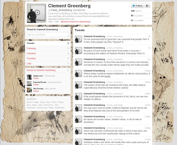 The fad for fake art personas has passed. They were soo 2010, though they lingered into 2011. Perhaps tired of the fakery, someone has decided to rekindle the words of the maestro of Modernism into 140 characters or less, @Clem_Greenberg.