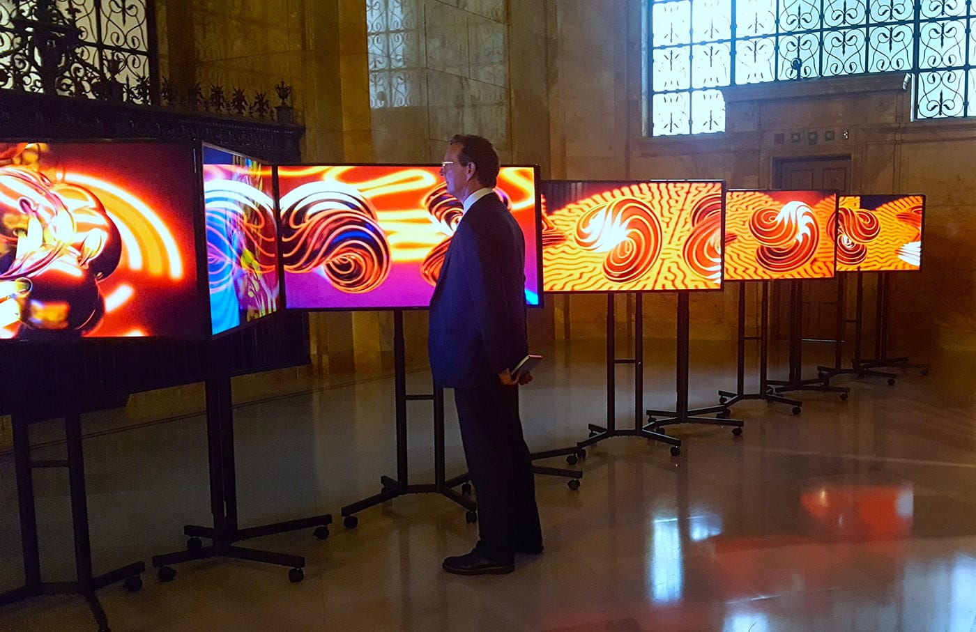 However, it is in the less conventional venue that FRONT’s offerings, and Grabner’s curatorial efforts, really shine. Philip Vanderhyden’s “Volatility Smile 3” (2018) is an iteration of his very contemporary, multi-screen digital collage work that in no way blends with its surroundings at the baroquely ornate Federal Reserve Bank in downtown Cleveland. And yet, the work inspired by Vanderhyden’s feelings of financial insecurity — “volatility smile” is a term for a common graph shape that describes a market dip formed by a group of options that share the same expiration date — strikes an incredibly tense conceptual and aesthetic balance in a space literally designed to inspire confidence in the capitalist system.