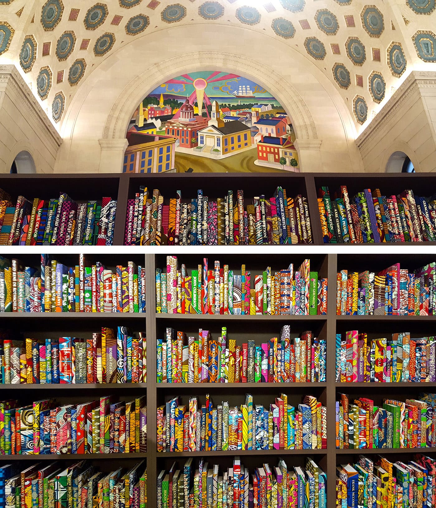 Likewise, there is an incredible impact to the placement of “The American Library” (2018) — a sequel to Yinka Shonibare’s 2014 installation, “The British Library” — sited at the Cleveland Public Library main branch downtown. First, visitors encounter a double-sided wall of books wrapped in Dutch wax print fabrics; a double-take reveals that these are artworks, not library books. Then comes the slower-breaking revelation that all of the 6,000 names gold-embossed on the book spines — many recognizable as names of contemporary celebrities and some 15% of them specific to Cleveland — denote people who are either direct or generational immigrants to the United States. The vibrant fabrics, which create an exceptionally satisfying relationship with the library’s surreal WPA-era mural in the installation’s background, serve as visual metaphor, in that they are culturally identified with Western Africa, where they were sold, but are in truth a product of Holland made in Indonesia. Considering our country’s current crisis of nationalism, these questions about authentic origin feel especially timely, and relevant to Cleveland, which was once within the top five gateway cities for immigration, and boasting, in 1900, a 33% foreign-born population.