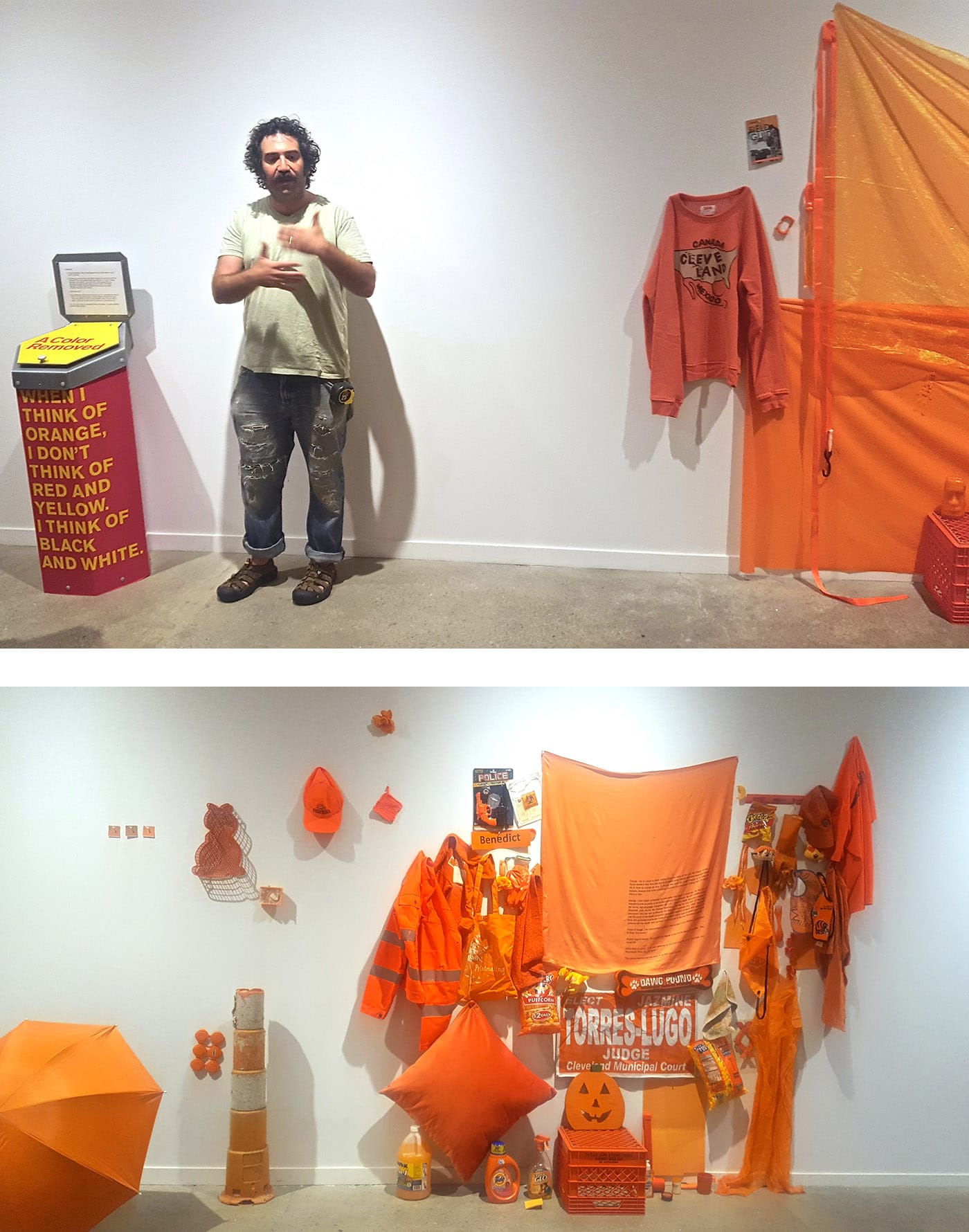 One of the only venues that made an exhaustive effort to acknowledge the people and the artists of Cleveland was, fittingly, the experimental and community-oriented SPACES, which houses the efforts of artist Michael Rakowitz. The Chicago-base Rakowitz has a longstanding practice that includes regular, direct engagement with people and places, which he expresses in multiple ways in his work for FRONT. Notably, Rakowitz turned over roughly half the gallery space to Cleveland-based artists, reserving only the back room for his own work, “A Color Removed” (2015–ongoing). Both galleries address the police shooting of 12-year-old Cleveland resident Tamir Rice on November 22, 2014. The incident, caught on security footage, rattled the entire country, but was felt especially keenly in Rice’s hometown. Rakowitz installed kiosks to collect any and all items in Cleveland that are “safety orange” — in reference to the so-called justification for the offending officers’ acquittal, which was that Rice was playing with a gun unidentifiable as a toy because the safety orange cap had been removed.