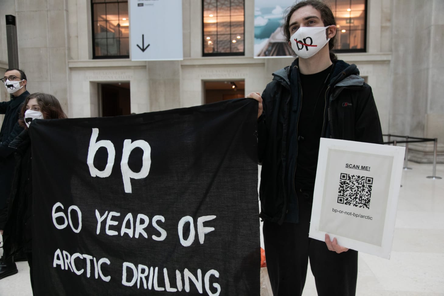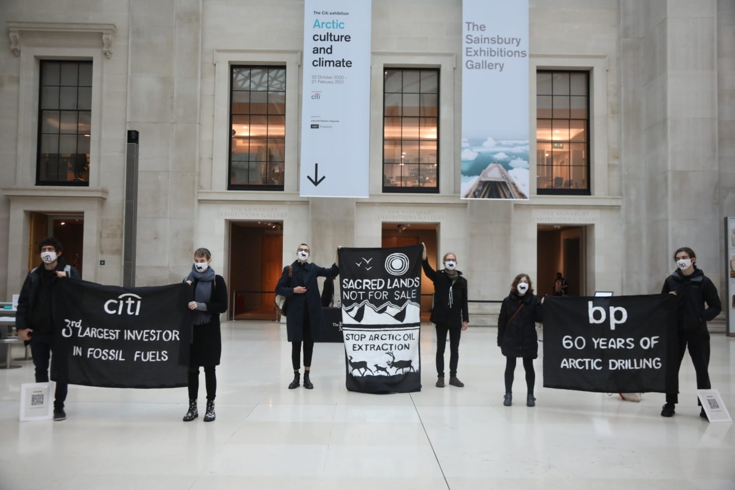 A masked and socially distanced group of six protesters unveiled three banners at the entrance to the exhibition as journalists arrived at the preview. A pair of banners pointed to the role that two of the museum’s funders, Citibank and the oil titan British Petroleum (BP), have played in furthering Arctic drilling and fossil fuel production.