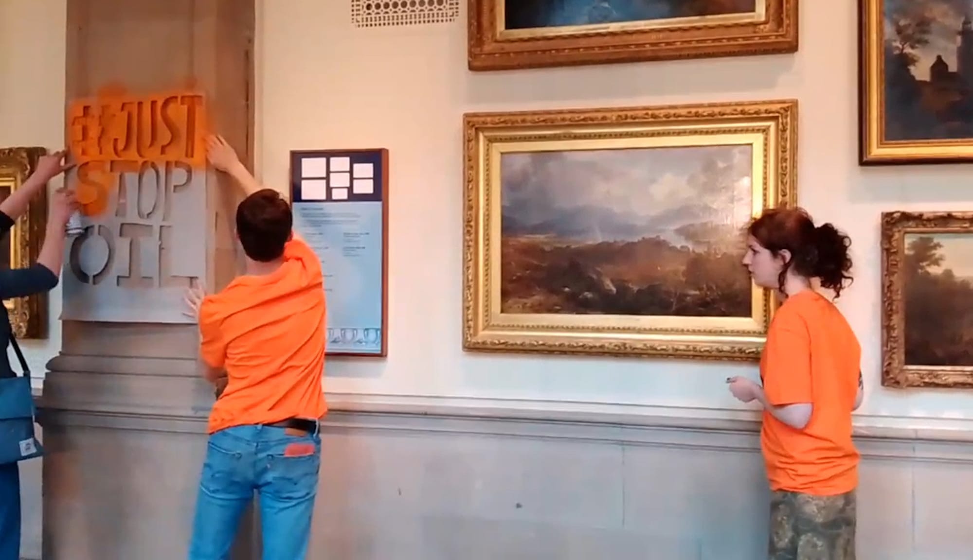 And while two activists were glued to McCullough's landscape, other members of the group spray-painted "#JustStopOil" on the museum's walls and floors, and another member delivered an impassioned speech in the atrium.