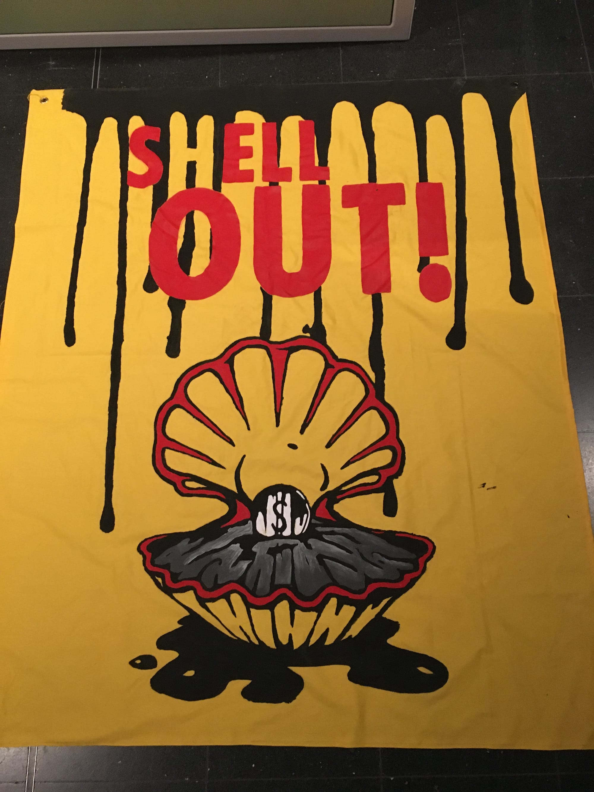 The following morning, the climate activists returned to congregate at the museum’s entrance on Sunday alongside members of the public, holding banners with the phrase “Shell Out.” After the protest, which lasted six hours, the protestors left a display of cardboard signs by the main entrance to the museum with messages such as: “Drop Shell” and “Keep it in the Ground”.