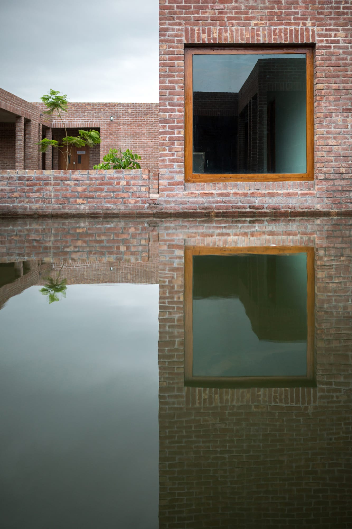 Prior to development, the site was nestled among grain fields, which were later converted into shrimp fisheries due to rising sea levels. Part of the building’s noteworthy design involves the draining and collection of rainwater from the campus in a tank, which both prevents the oversaturation of water and allows that water to be used. This rainwater harvesting feature is particularly useful in an area that receives prodigious rain during the monsoon season that nevertheless cannot be used when it mixes with salty groundwater.