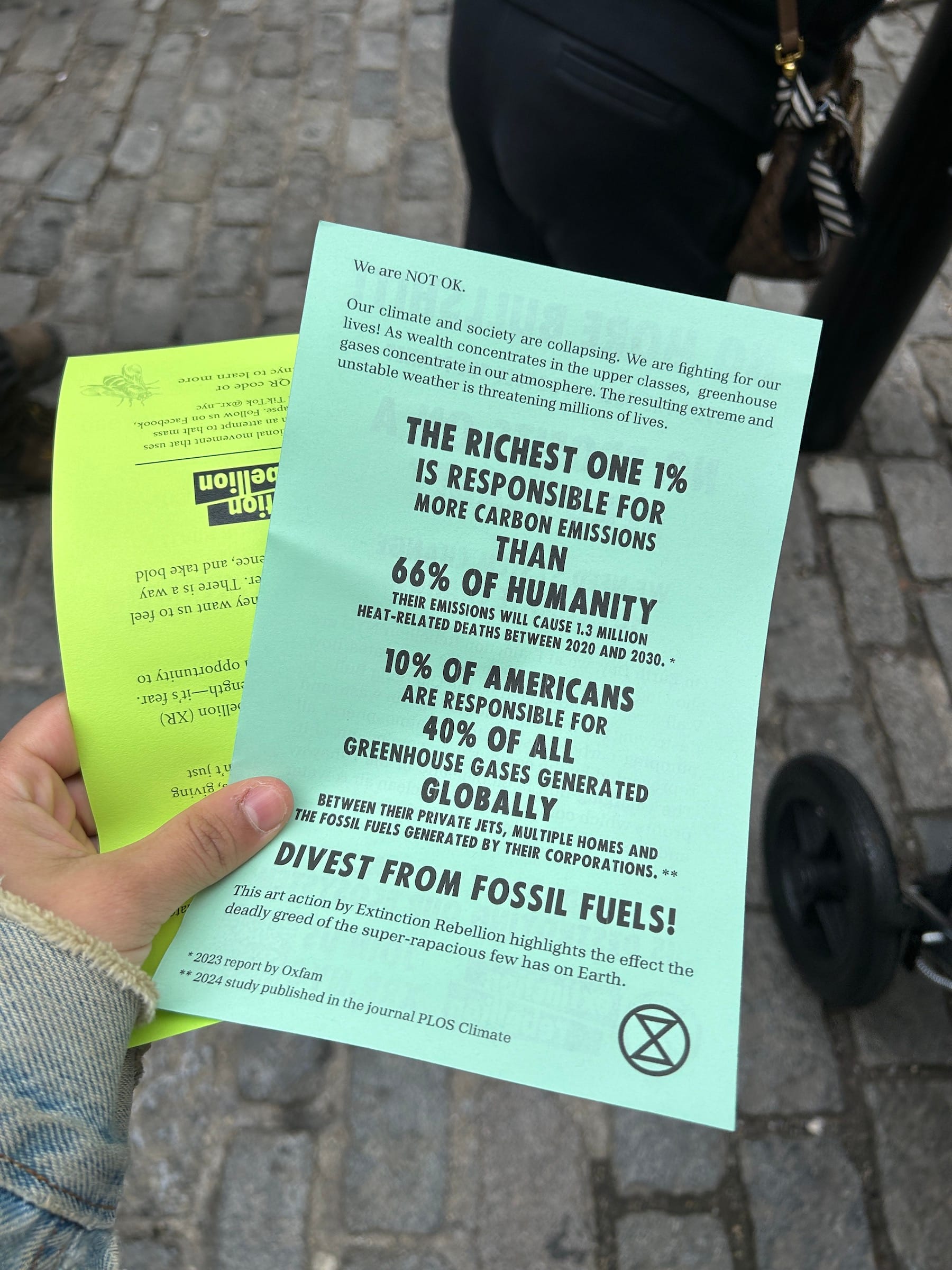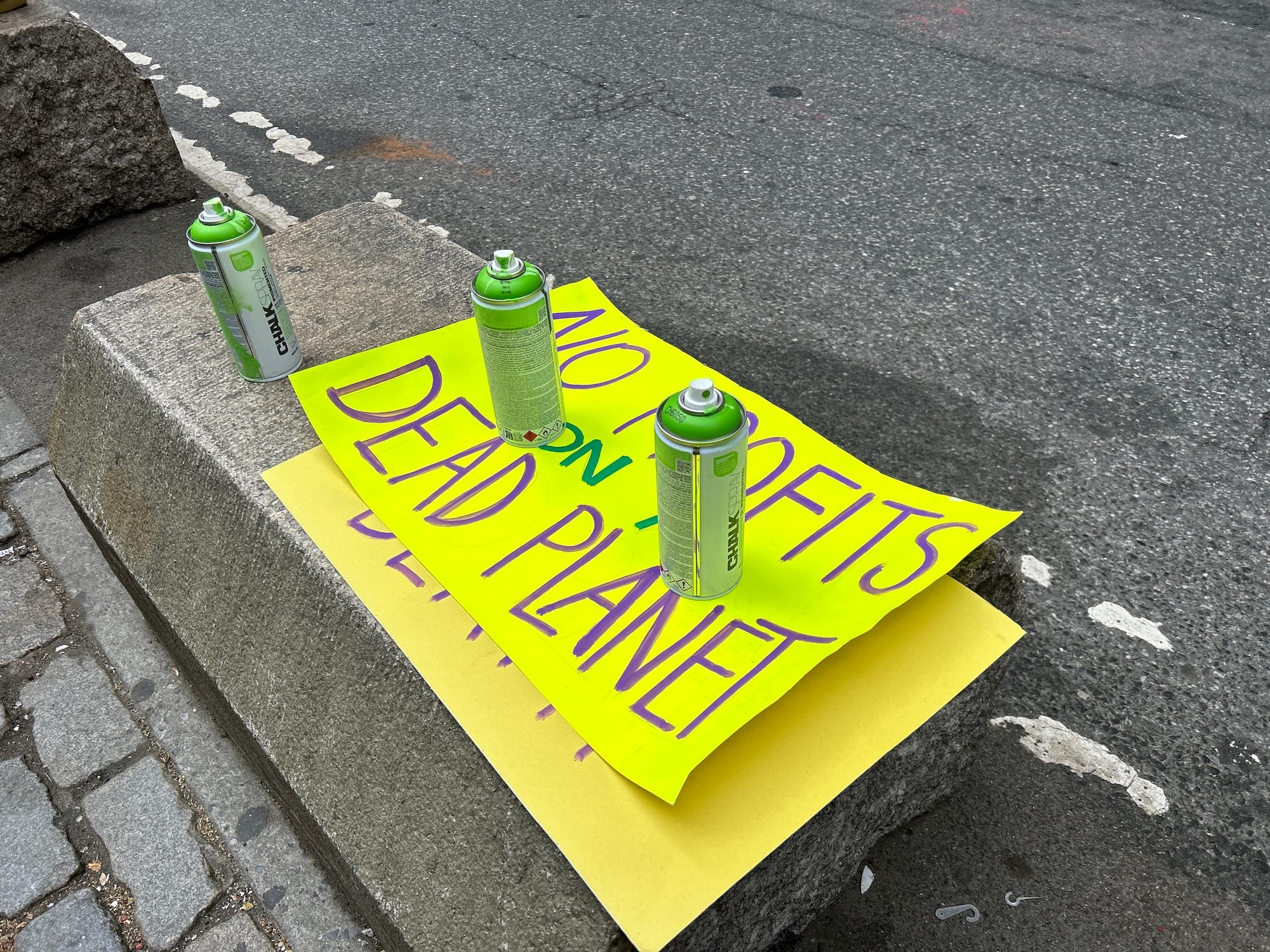 Aliyah Graves, a hybrid office worker who was on her way to work with an iced coffee in hand, told Hyperallergic that while she was not familiar with the climate emergency group, she immediately understood their message.