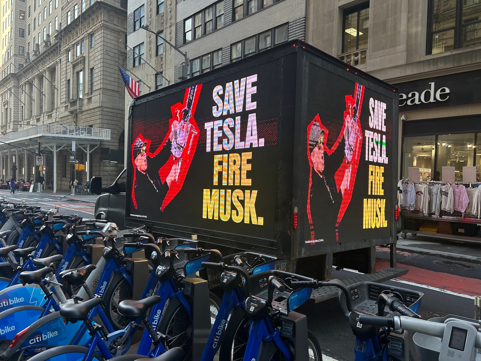 The Extinction Rebellion protest was one of several Earth Day demonstrations this morning on Wall Street. During the action, an unaffiliated billboard truck criticizing Elon Musk drove through the downtown Manhattan neighborhood’s streets. The climate group also tagged the Tesla showroom in downtown Manhattan in another environmental protest, during which the group said two of their members were taken into custody.