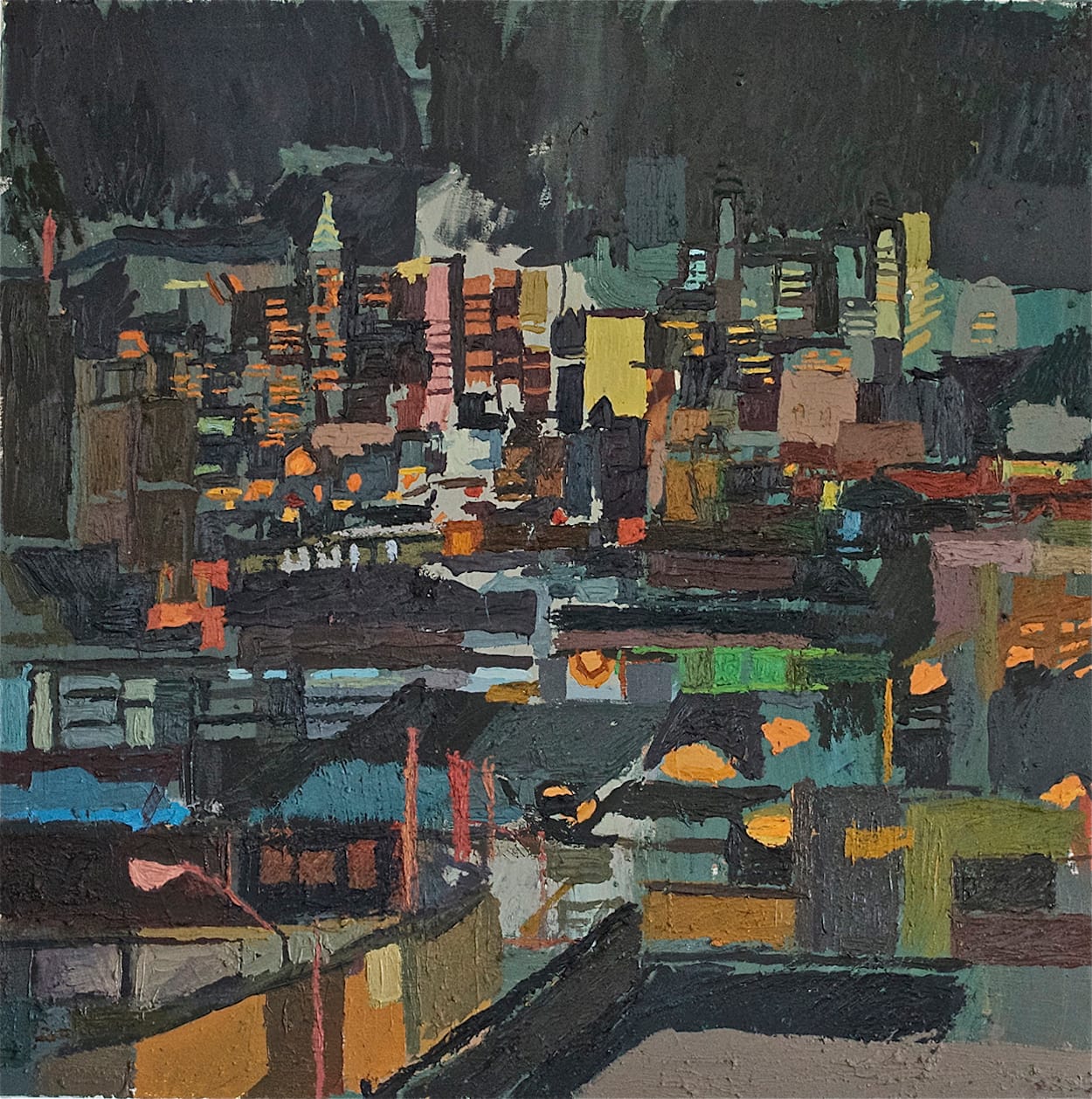Steed strokes the paste-like paint onto the surface, creating an uneven tactile skin that is pebbled and brushy. This tactility is at odds with our digital world – its endless barrage of bodiless images of light. Should Steed be part of his time and produce more of the same? One thing I get from this painting is Steed’s empathy for the grittiness of New York, the commonplace views in which towers of wealth stand in the distance – a cluster of glass and steel turrets, our postmodern Emerald City – overlooking less posh and less efficient circumstances. It’s nighttime. An atmosphere of quiet isolation and solitude pervades the scene. Steed has established a dance between image and materiality, opening a space for reflection. How might we see this view, so romanticized in trashy films like Woody Allen’s Manhattan (1979), if we weren’t so conditioned to gaze in awe? And might we not see the low rooftops – their parallelograms and trapezoids in the foreground – as evidence of stunted growth and obeisance before the towers?