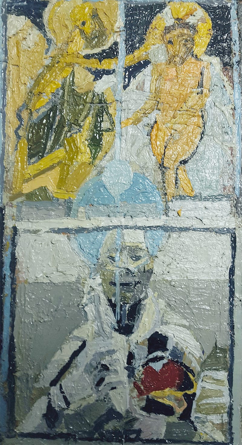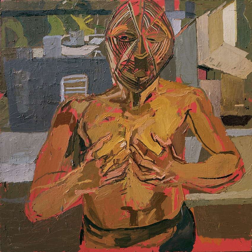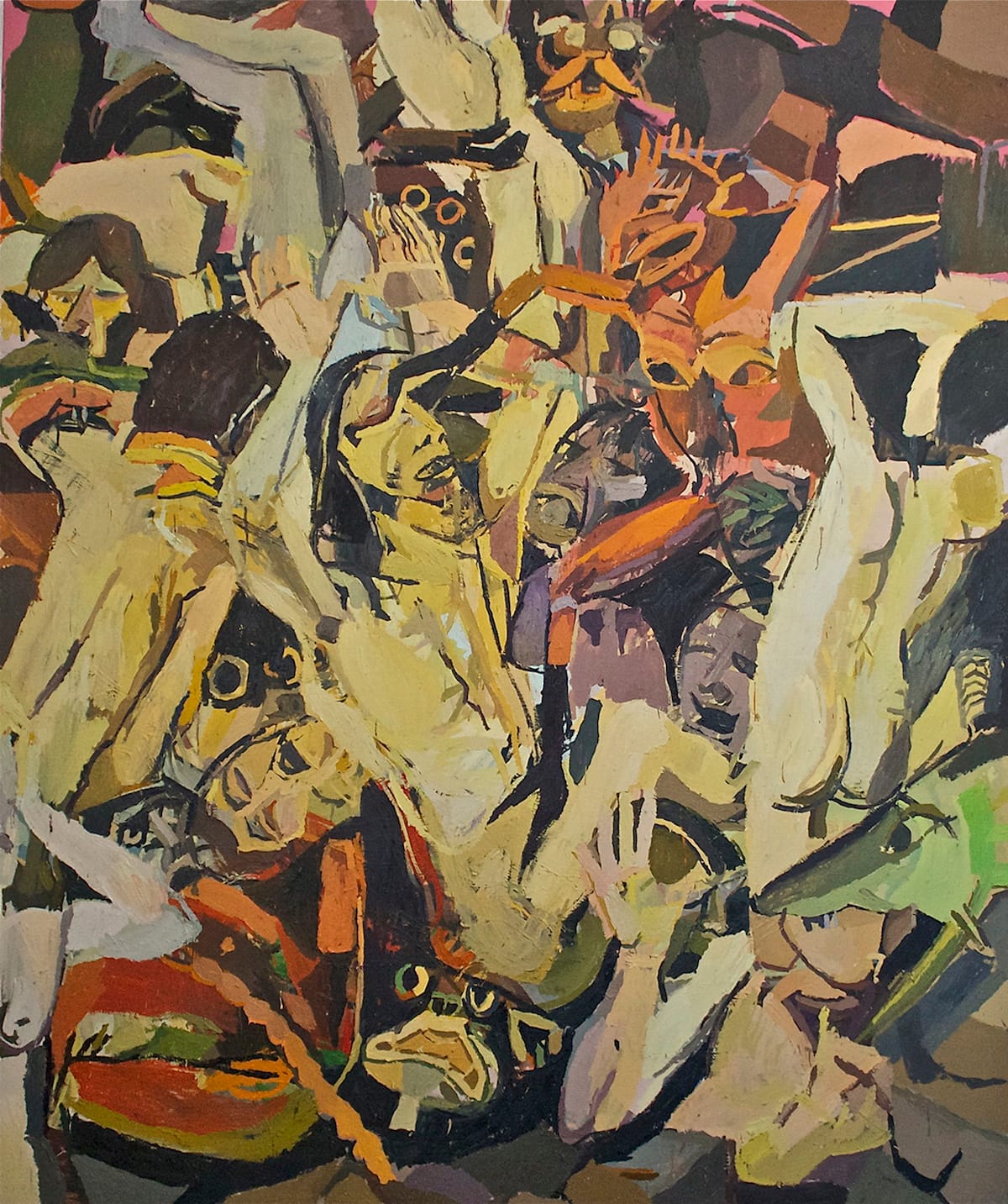 The exhibition’s standout painting, “Rubens, Fall of the Damned” (2016), isolates a section of Peter Paul Rubens’ monumental masterpiece depicting the archangel Michael hurling bodies out of heaven. The Rubens painting is a tumultuous cascade of bodies sliding, toppling, and free-falling towards the abyss — an unpitying metaphor of our mortality and a prescient evocation of our present situation. In his distortions and use of color, Steed seems to have been inspired by the German Expressionists Max Beckmann and Ernst Ludwig Kirchner, who, in turn, were influenced by African art. In Steed’s painting, humans and beasts have been pressed together – the skin tones range from sickly green to orange-brown to black. While the artist cites the source in his title, the view he offers us doesn’t show heaven or hell. There’s no context for this pandemonium and perhaps he doesn’t have to tell us more. He engages our imagination, and it is up to us to finish the story of what we are looking at.