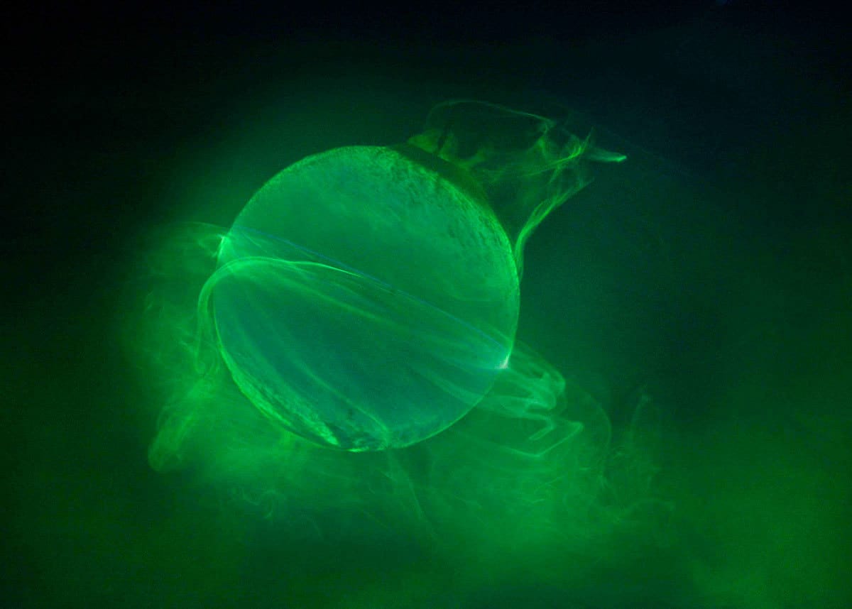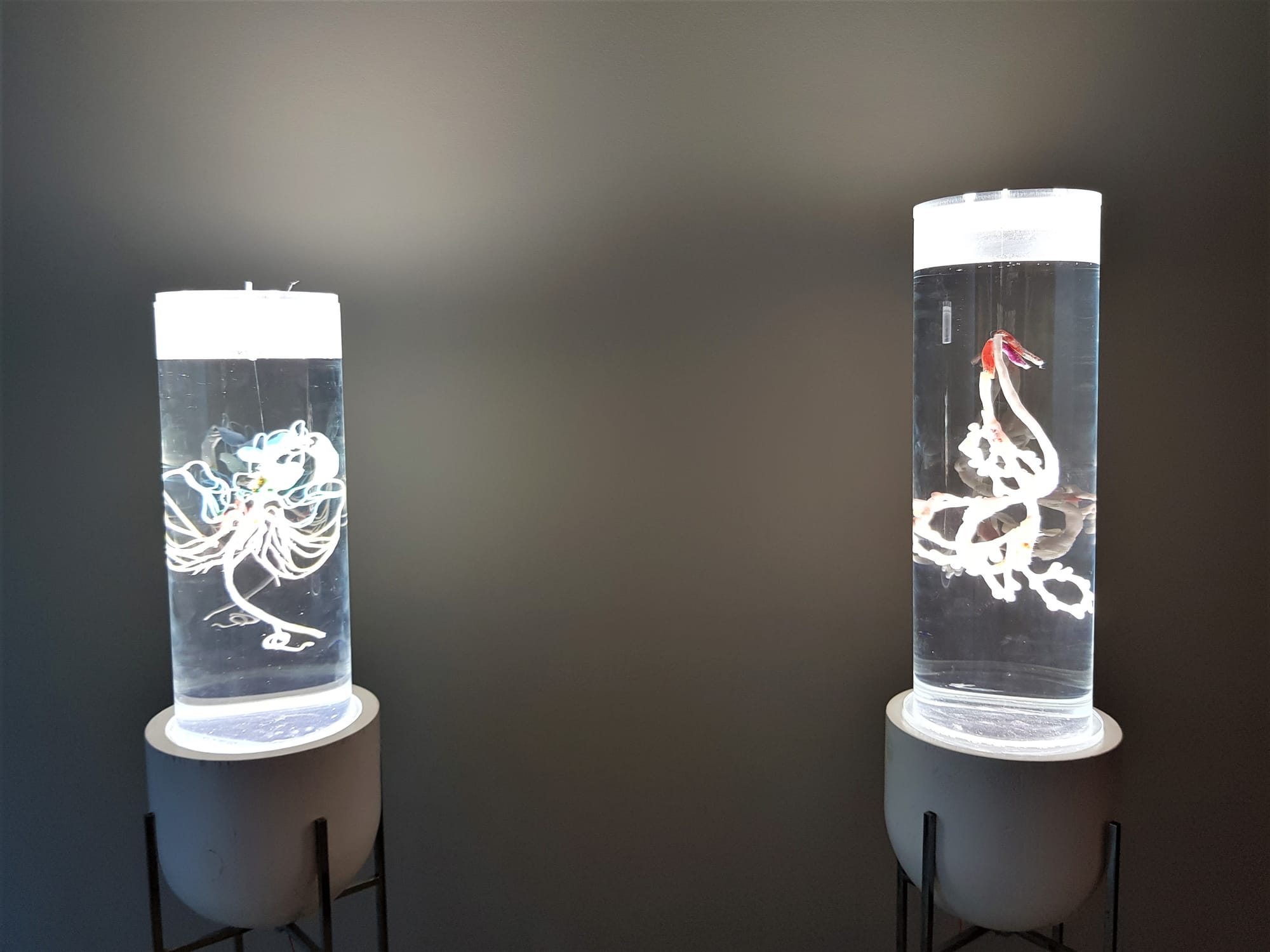 On entering the exhibition, visitors are faced with “Domestic catastrophe No3: La Planete Laboratoire” (2019) by artist collective HeHe, in which a revolving globe in a tank of water is gradually wrapped in a murky green dye. It evokes both the smothering of the planet by greenhouse gases and humanity’s disproportionately slow response.
