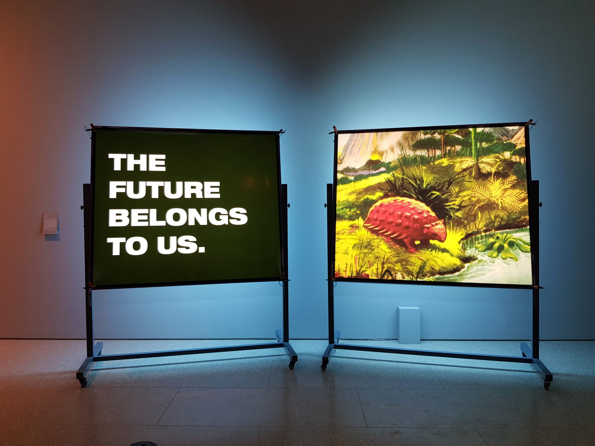 In the same section, Basim Magdy’s “Our Prehistoric Fate” (2011) presents Duraclear prints of a prehistoric creature and of a text that reads “the future belongs to us,” clamped onto Yugoslavian military lightboxes. The work effectively links anxiety about nuclear war with anxiety about climate breakdown, while two works from Pinar Yoldas’s series An Ecosystem of Excess (2013-17) reimagine a biological future in which organisms are able to live on humanity’s plastic waste. In these sculptural pieces, strange invented specimens are suspended in liquid and illuminated from below; it is a sci-fi dream for a weirdly consumption-focused utopia.
