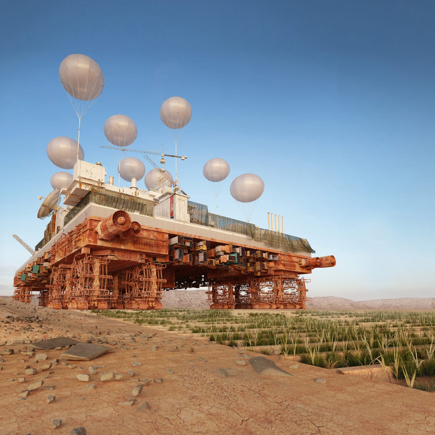 The exhibition abounds in speculative science-fiction-like approaches to a post-carbon or newly eco-conscious future, from designs for floating cities and machines for regenerating deserts to biogas power plants and tools to develop the human digestive system. These works address important issues regarding environmental consciousness and the future. But Eco-Visionaries presents a very specific image of environmental art and design. The overall aesthetic is overwhelmingly technological — as are many of the proposed “solutions” to the problems facing our world. The selection of works in the exhibition suggest that technology is our main hope for a better future, generally ignoring the current discourse around natural climate solutions.