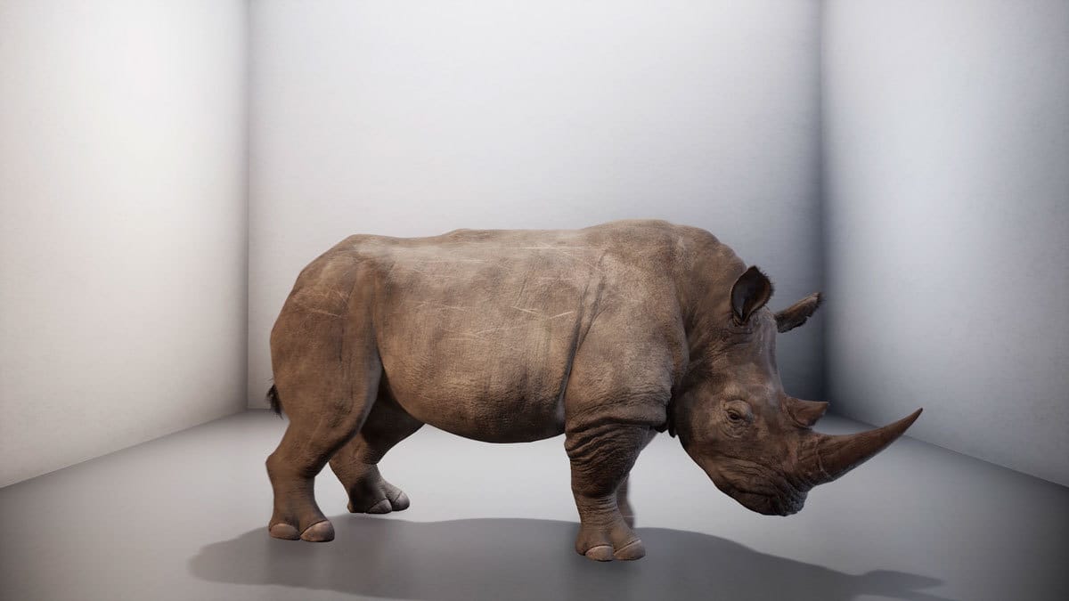 Utopian and dystopian futures collide in works such as Alexandra Daisy Ginsberg’s “The Substitute” (2019), which brings viewers face-to-face with a life-sized digital reproduction of the functionally extinct northern white rhinoceros. Stomping around a white-cube CGI room, this AI-assisted “substitute” animal fluctuates between stylized pixels and photorealism, pointing to the imaginative power of AI technology — and its total failure to meaningfully stand in for nonhuman life.