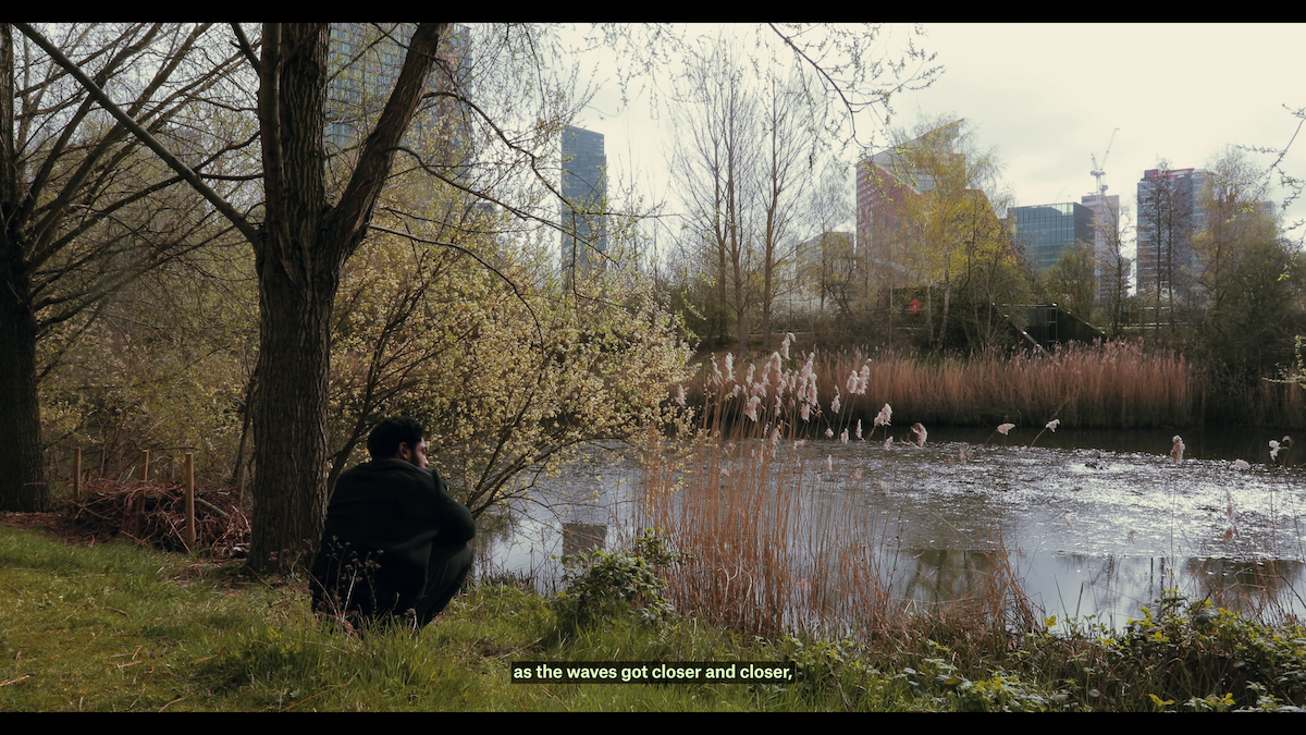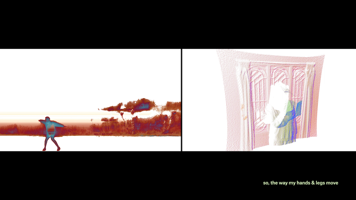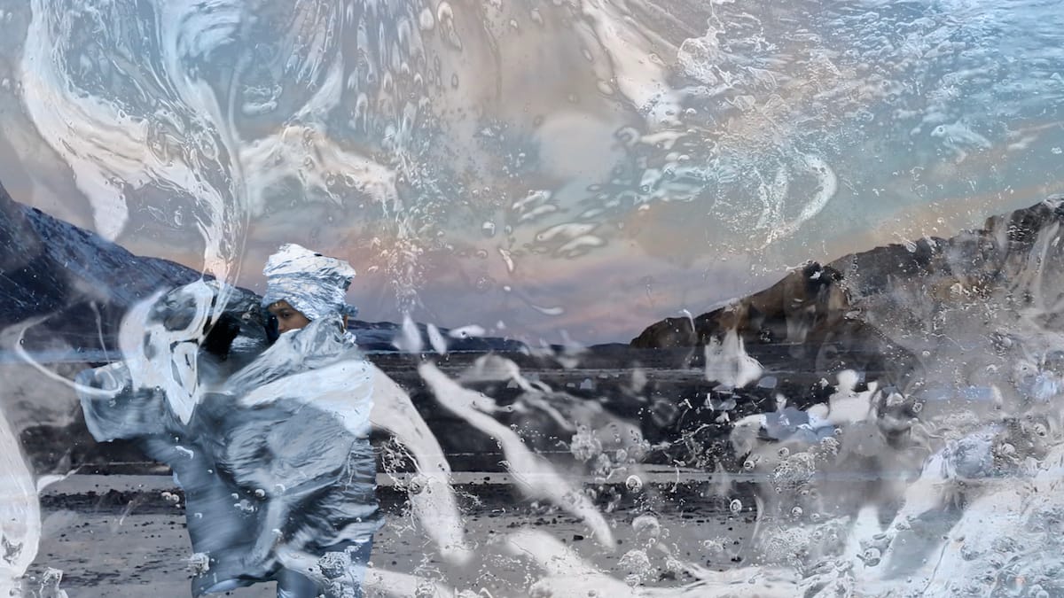 Kumaraswamy’s four-part video “ಇರುವು Iruvu (Presence)” delves into the subaltern male body as a site of struggle, subjugation and resilience who carries “physical, communal, familial and emotional weight,” as the video states. The main figure is on a never-ending voyage, moving through natural, digital and domestic spaces. Act I begins with a figure on the shore of a riverbank, contemplating the body of water that separates him from an unreachable shore. He moves slowly and rhythmically, as if caught underwater. Act IV ends with a meditation and reimagination of liberatory space through the metaphor of water as well as a dismissal of the desire to access oppressive spaces, eschewing “the walls you’ve built or your doors that keep us out.” The recurring figure now moves with purpose and power.