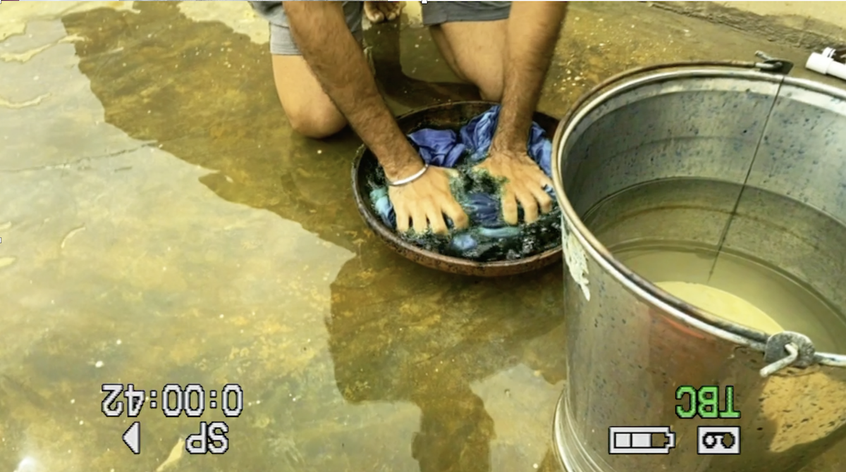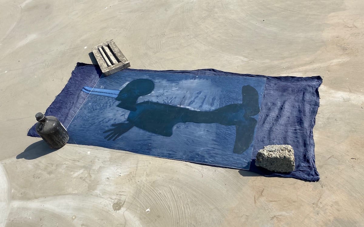 The ritual of “weathering” takes place in many stages of the artist's process to create the series of installations. Bhutto travels into archival material, including “Secrets of the Blind Dolphin” by Dr. George Pilleri, and the river itself to survey and source material, sets up his pinhole camera to photograph, exposes the prints to sunlight on the roof of his family home, then rigorously rinses the fabrics in water until they are finally left to dry.
