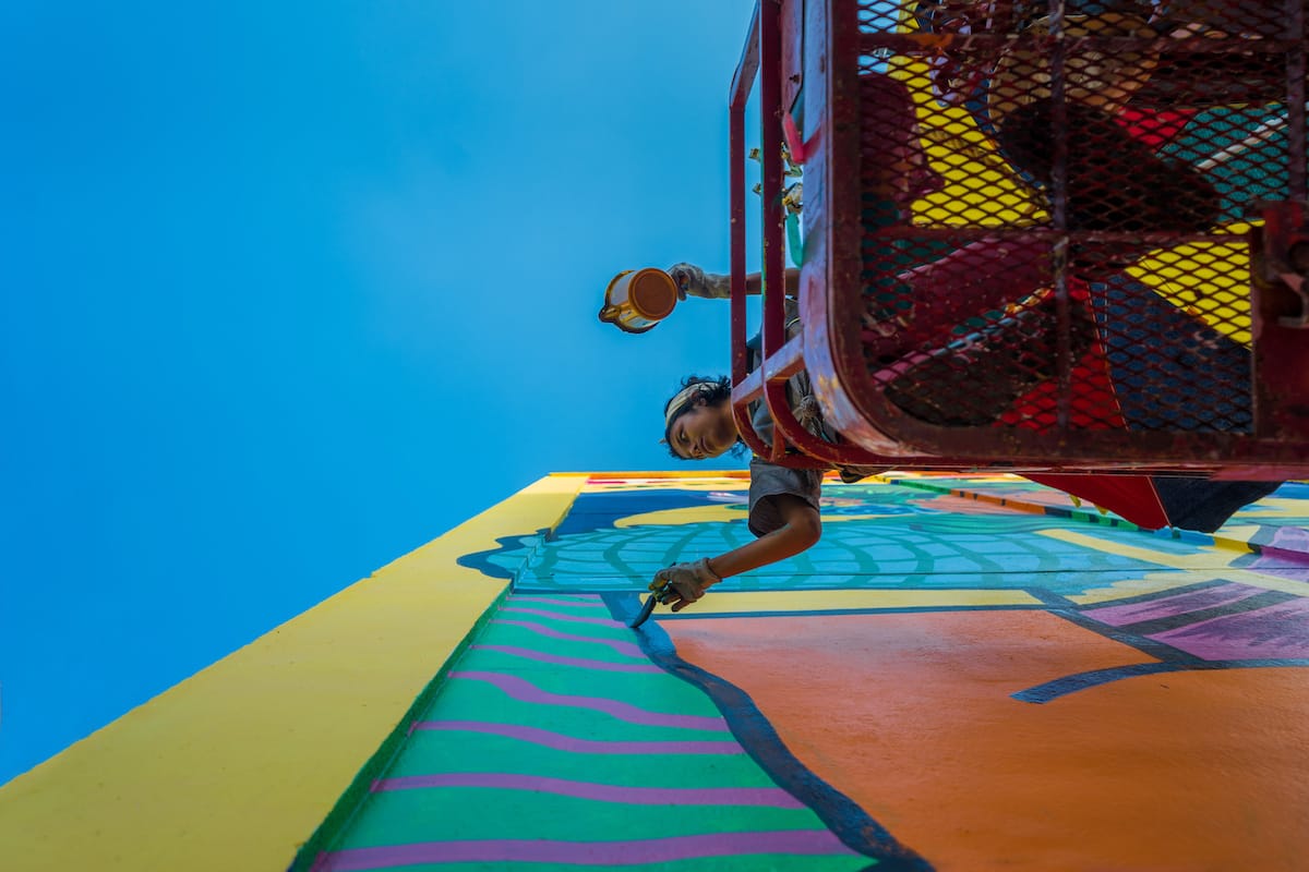 “Murals and public art are one of my favorite mediums to explore so it is democratic. Most of the murals that I work on are based on that specific community or the area that the wall is in. It makes sense to create something for the viewers [and] for the people that are around it,” she shares. For example, the mural “Protectors and Providers” animates the integral role of women in the local fisherfolk community of Chennai who sustain the health of their households and economy.