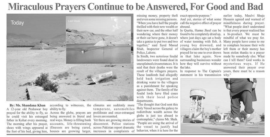 He offers “SpaceMosque” as a retrofuturist parafiction. A spectacular vessel arrives from the future, granting all humans on Earth one prayer every 24 hours. The vessel is a prayer portal that manifests in many iterations, utilizing a divine algorithm to adjust its appearance to the seeker. Prayer becomes the ultimate currency, leading to “both great miracles and great tragedies,” until the SpaceMosque disappears.